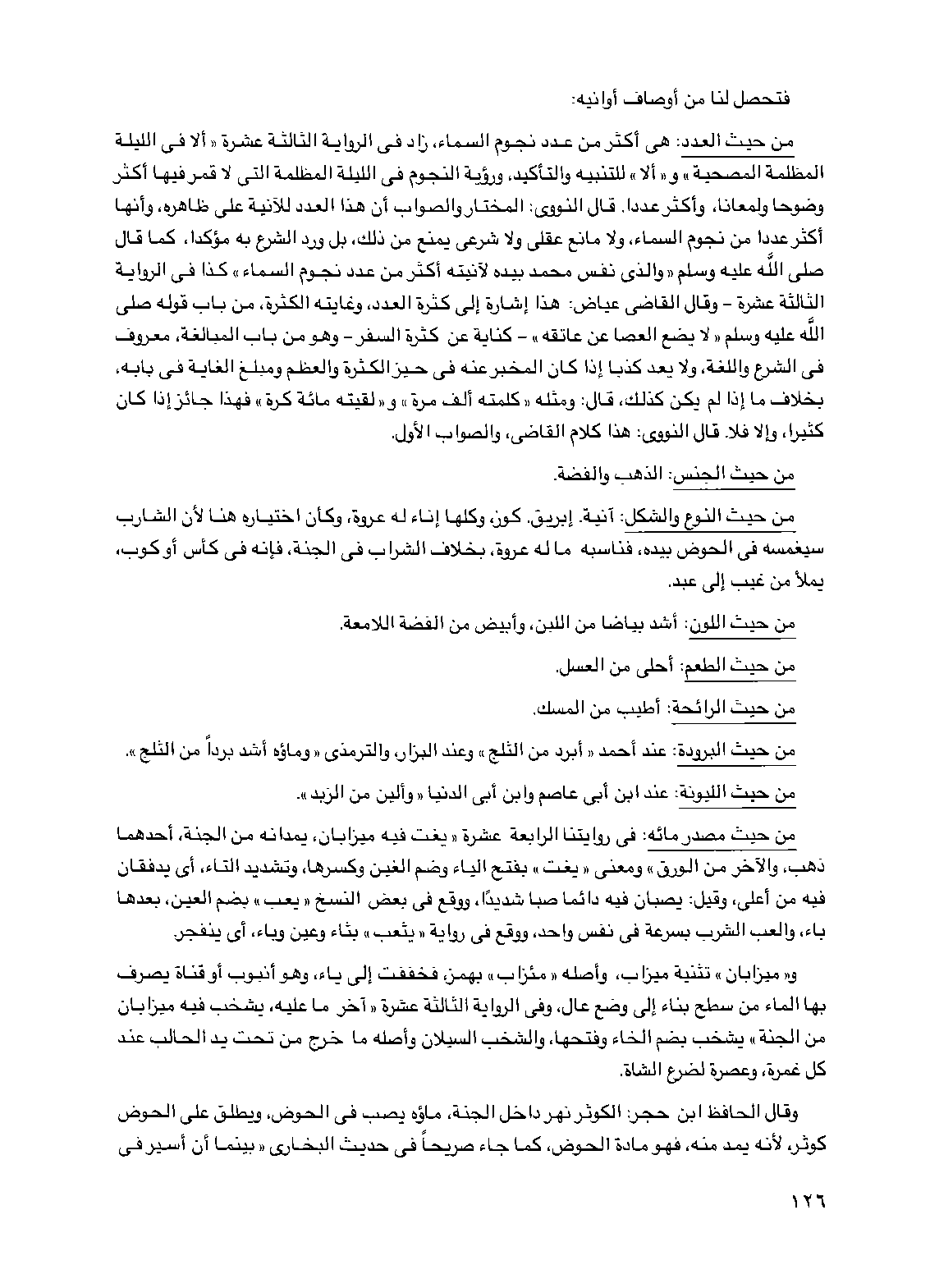 من حيث العدد: هي أكثر من عدد نجوم السماء، زاد في الرواية الثالثة عشرة "ألا في الليلة المظلمة المصحية" و"ألا" للتنبيه والتأكيد، ورؤية النجوم في الليلة المظلمة التي لا قمر فيها أكثر وضوحا ولمعانا، وأكثر عددا. قال النووي: المختار والصواب أن هذا العدد للآنية على ظاهره، وأنها أكثر عددا من نجوم السماء، ولا مانع عقلي ولا شرعي يمنع من ذلك، بل ورد الشرع به مؤكدا، كما قال صلى الله عليه وسلم "والذي نفس محمد بيده لآنيته أكثر من عدد نجوم السماء" كذا في الرواية الثالثة عشرة - وقال القاضي عياض: هذا إشارة إلى كثرة العدد، وغايته الكثرة، من باب قوله صلى الله عليه وسلم "لا يضع العصا عن عاتقه" - كناية عن كثرة السفر - وهو من باب المبالغة، معروف في الشرع واللغة، ولا يعد كذبا إذا كان المخبر عنه في حيز الكثرة والعظم ومبلغ الغاية في بابه، بخلاف ما إذا لم يكن كذلك، قال: ومثله "كلمته ألف مرة" و"لقيته مائة كرة" فهذا جائز إذا كان كثيرا، وإلا فلا، قال النووي: هذا كلام القاضي، الصواب الأول.