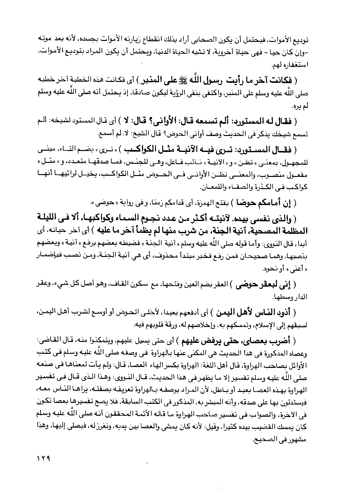 (فقال المستورد: ترى فيه الآنية مثل الكواكب) "ترى" بضم التاء، مبني للمجهول، بمعنى "تظن" و"الآنية" نائب فاعل، وهي للجنس، فما صدقها متعدد، و"مثل" مفعول منصوب، والمعنى تظن الأواني في الحوض مثل الكواكب، يخيل لرائيها أنها كواكب في الكثرة والصفاء واللمعان.