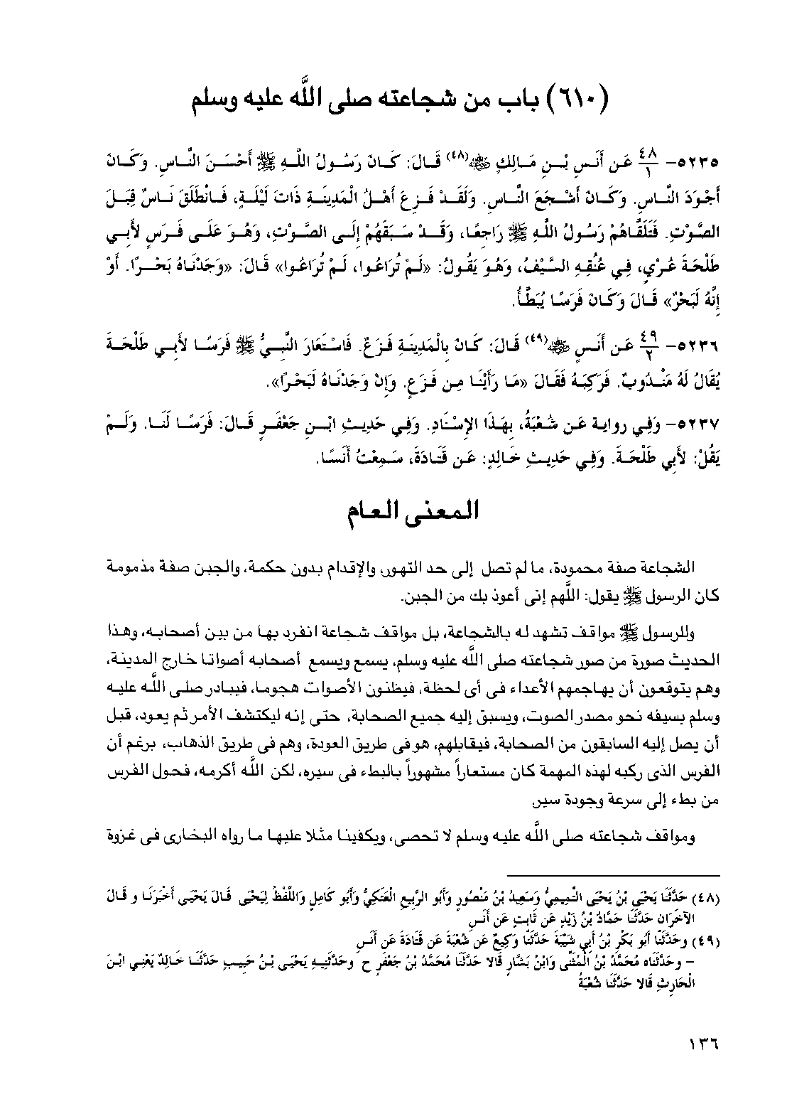 5235 - عن أنس بن مالك رضي الله عنه قال: كان رسول الله صلى الله عليه وسلم أحسن الناس. وكان أجود الناس. وكان أشجع الناس. ولقد فزع أهل المدينة ذات ليلة، فانطلق ناس قبل الصوت. فتلقاهم رسول الله صلى الله عليه وسلم راجعا، وقد سبقهم إلى الصوت، وهو على فرس لأبي طلحة عري، في عنقه السيف، وهو يقول: "لم تراعوا، لم تراعوا" قال: "وجدناه بحرا. أو إنه لبحر" قال وكان فرسا يبطأ.