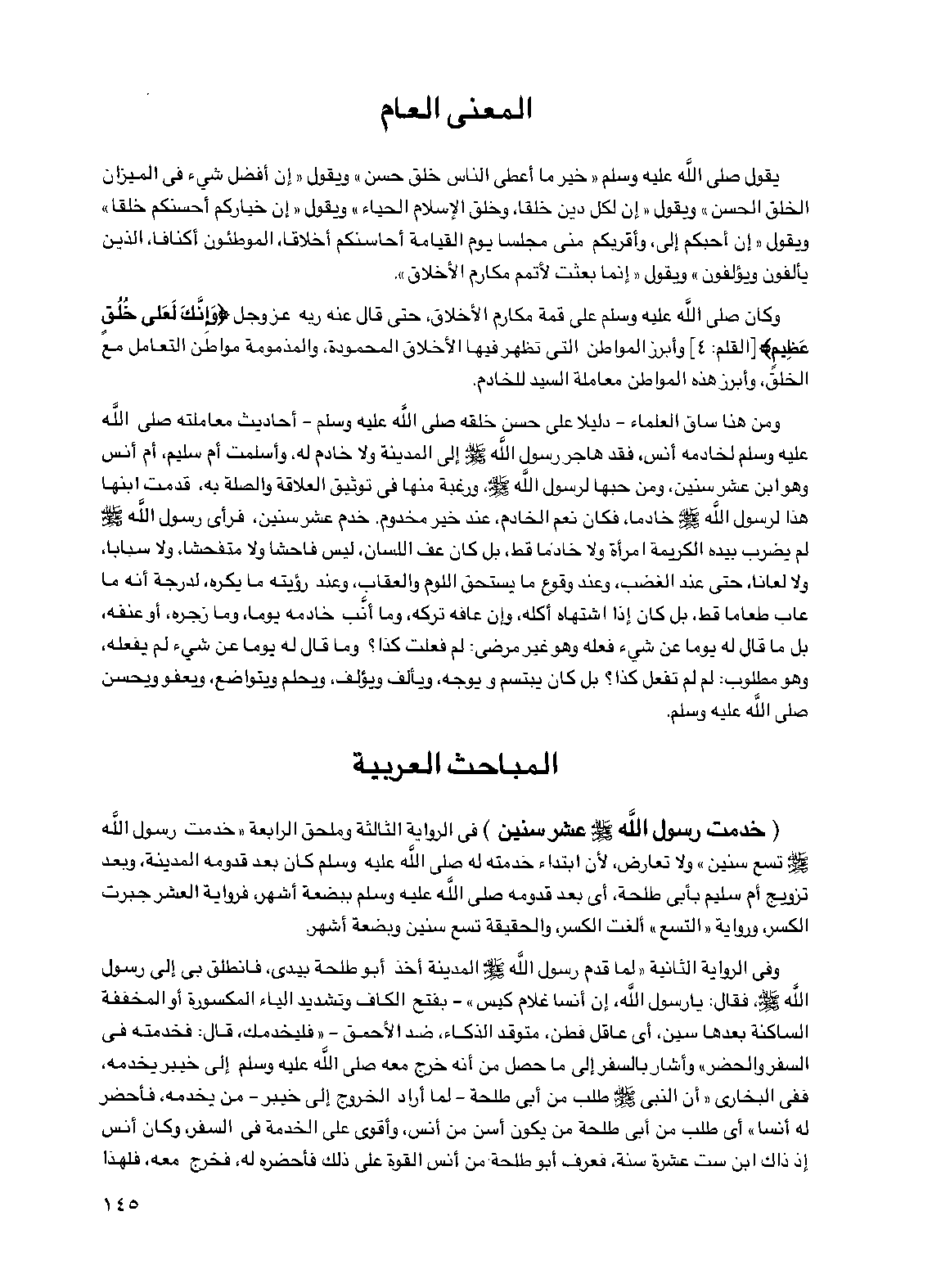 ومن هنا ساق العلماء - دليلا على حسن خلقه صلى الله عليه وسلم - أحاديث معاملته صلى الله عليه وسلم لخادمه أنس، فقد هاجر رسول الله صلى الله عليه وسلم إلى المدينة ولا خادم له، وأسلمت أم سليم أم أنس وهو ابن عشر سنين ومن حبها لرسول الله صلى الله عليه وسلم ورغبة منها في توثيق العلاقة والصلة به قدمت ابنها هذا لرسول الله صلى الله عليه وسلم خادما فكان نعم الخادم عند خير مخدوم خدم عشر سنين فرأى رسول الله صلى الله عليه وسلم لم يضرب بيده الكريمة امرأة ولا خادما قط بل كان عف اللسان ليس فاحشا ولا متفحشا ولا سبابا ولا لعانا حتى عند الغضب وعند وقوع ما يستحق اللوم والعقاب وعند رؤيته ما يكره لدرجة أنه ما عاب طعاما قط بل كان إذا اشتهاه أكله وإن عافه تركه وما أنب خادمه يوما وما زجره أو عنفه بل ما قال له يوما عن شيء فعله وهو غير مرضي: لم فعلت كذا؟ وما قال له يوما عن شيء لم يفعله وهو مطلوب: لم لم تفعل كذا؟ بل كان يبتسم ويوجه ويألف ويؤلف ويحلم ويتواضع ويعفو ويحسن صلى الله عليه وسلم.