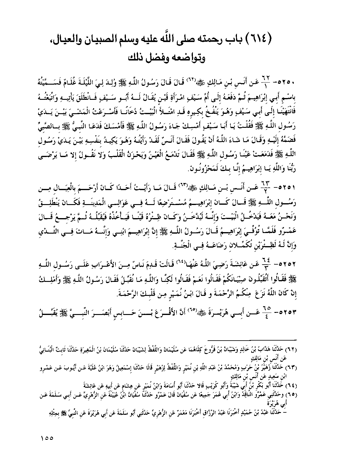 5251 - عن أنس بن مالك رضي الله عنه قال ما رأيت أحدا كان أرحم بالعيال من رسول الله صلى الله عليه وسلم قال كان إبراهيم مسترضعا له في عوالي المدينة فكان ينطلق ونحن معه فيدخل البيت وإنه ليدخن وكان ظئره قينا فيأخذه فيقبله ثم يرجع قال عمرو فلما توفي إبراهيم قال رسول الله صلى الله عليه وسلم إن إبراهيم ابني وإنه مات في الثدي وإن له لظئرين تكملان رضاعه في الجنة.
