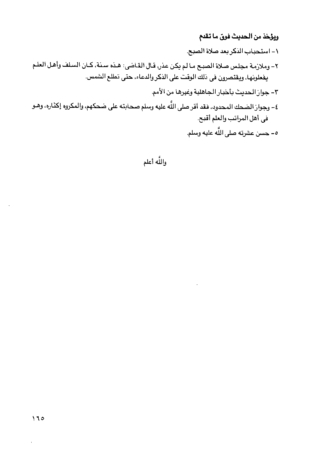 4 - وجواز الضحك المحدود، فقد أقر صلى الله عليه وسلم صحابته على ضحكهم، والمكروه إكثاره، وهو في أهل المراتب والعلم أقبح.