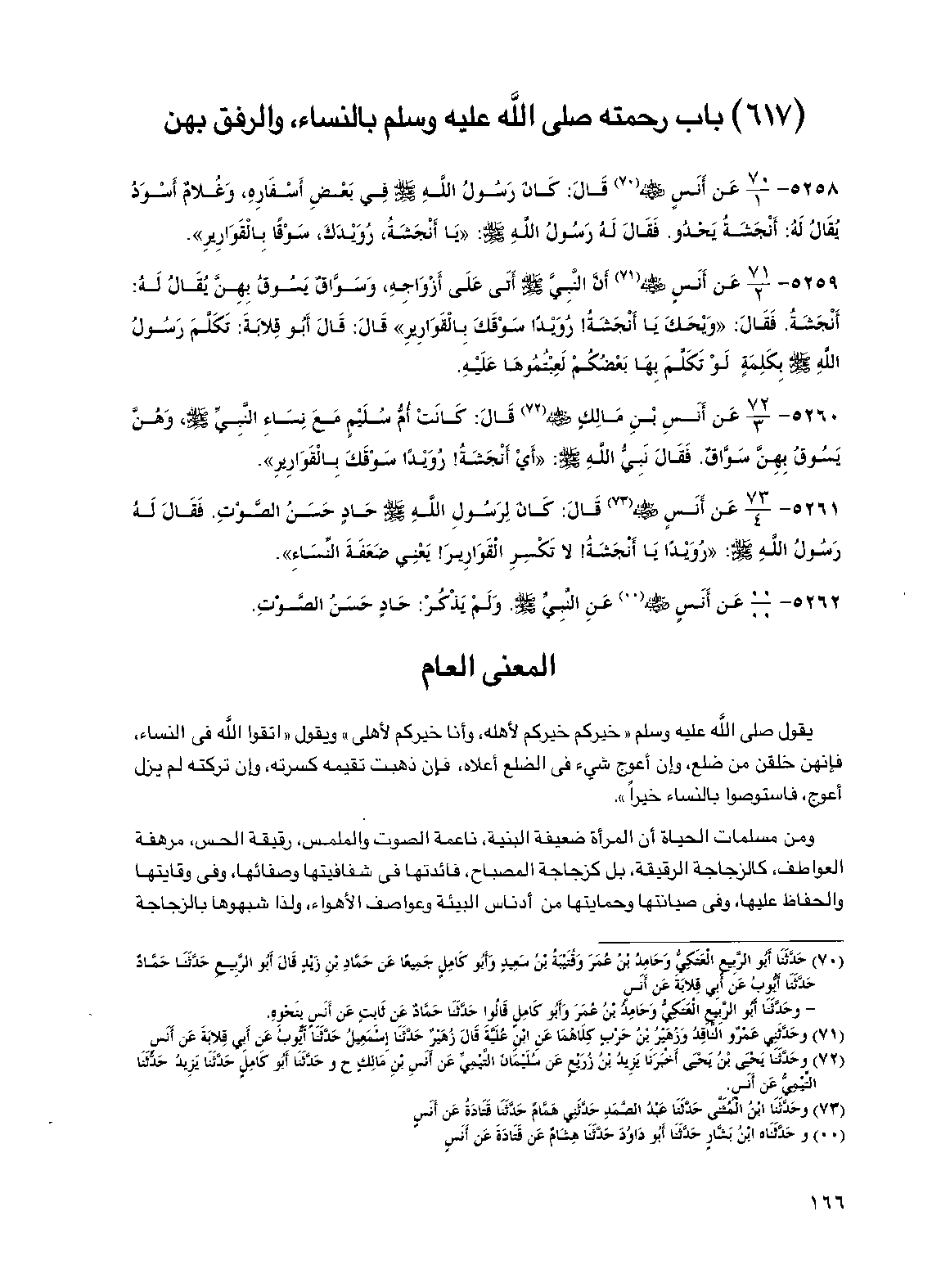 5258 - عن أنس رضي الله عنه قال: كان رسول الله صلى الله عليه وسلم في بعض أسفاره، وغلام أسود يقال له: أنجشة يحدو، فقال له رسول الله صلى الله عليه وسلم: "يا أنجشة، رويدك، سوقا بالقوارير".
