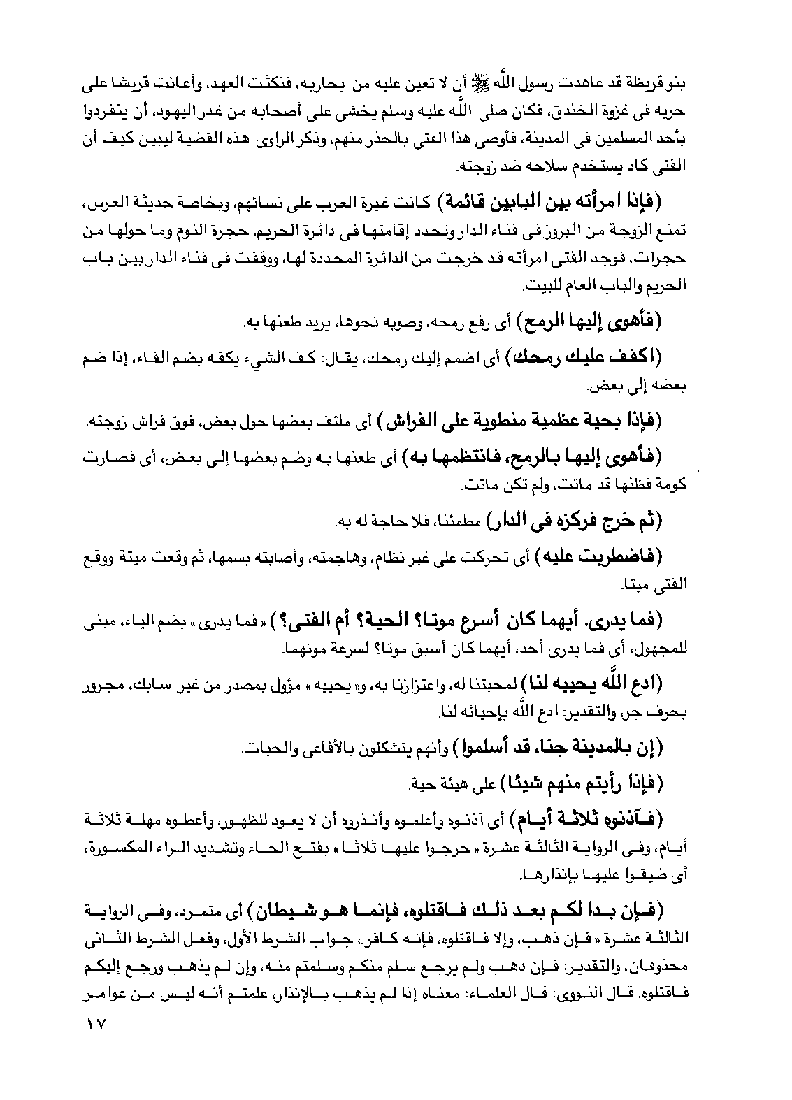 بنو قريظة قد عاهدت رسول الله صلى الله عليه وسلم أن لا تعين عليه من يحاربه، فنكثت العهد، وأعانت قريشا على حربه في غزوة الخندق، فكان صلى الله عليه وسلم يخشى على أصحابه من غدر اليهود، أن ينفردوا بأحد المسلمين في المدينة، فأوصى هذا الفتى بالحذر منهم، وذكر الراوي هذه القضية ليبين كيف أن الفتى كاد يستخدم سلاحه ضد زوجته.