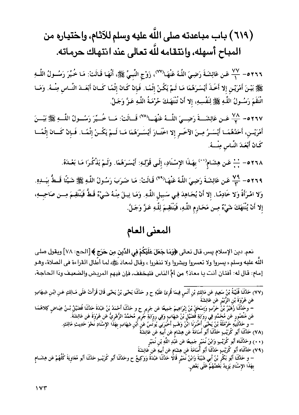5267 - عن عائشة رضي الله عنها قالت: ما خير رسول الله صلى الله عليه وسلم بين أمرين، أحدهما أيسر من الآخر إلا اختار أيسرهما ما لم يكن إثما. فإن كان إثما كان أبعد الناس منه.