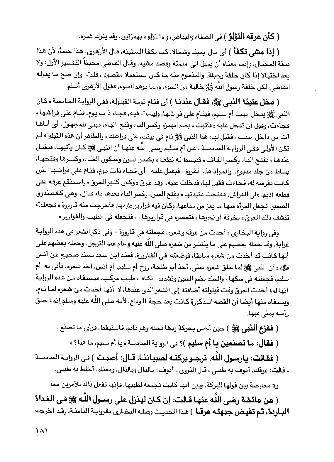 (كأن عرقه اللؤلؤ) في الصفاء والبياض، و"اللؤلؤ" بهمزتين، وقد يترك همزه.