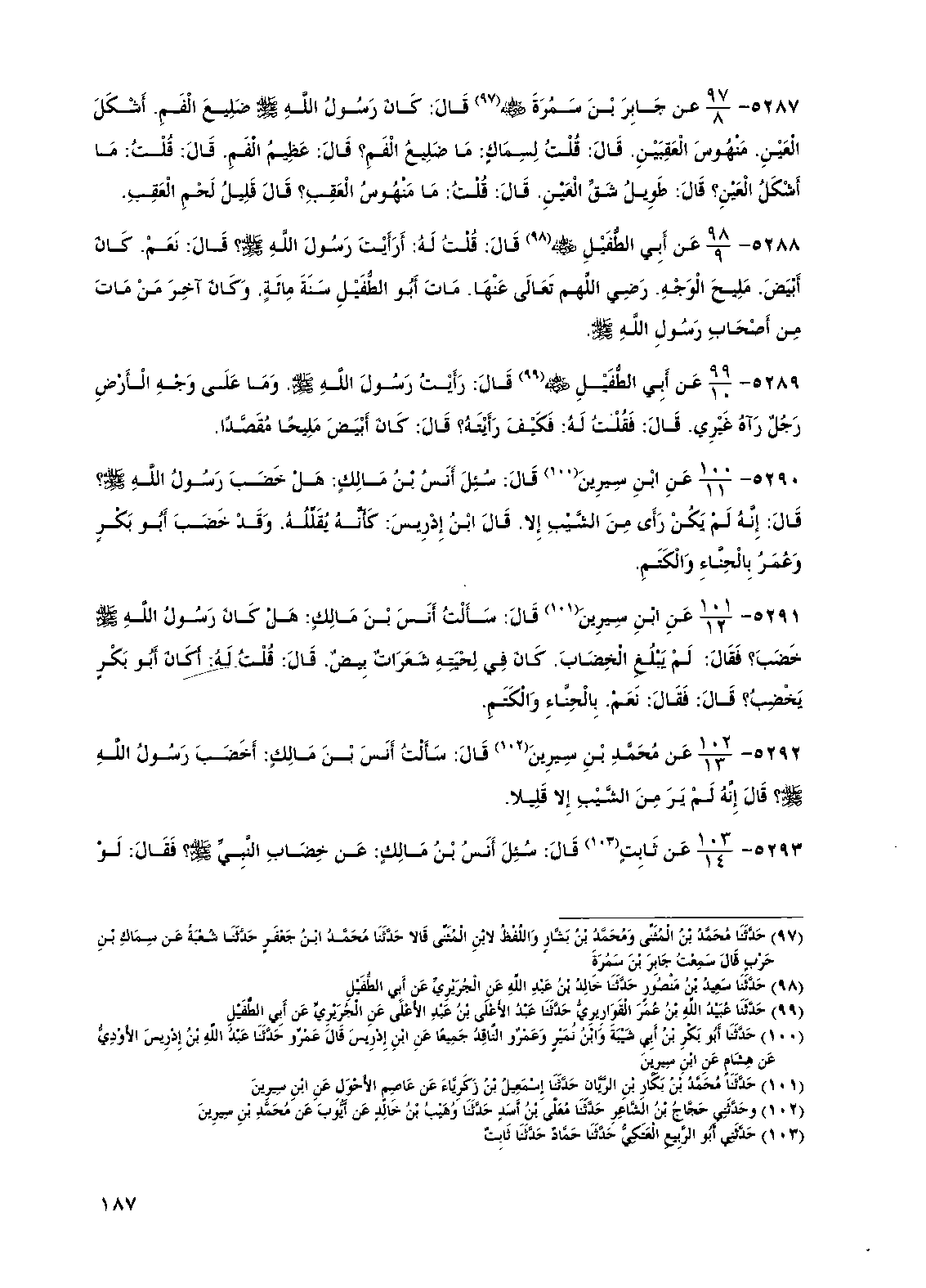 5292 - عن محمد بن سيرين قال: سألت أنس بن مالك: أخضب رسول الله صلى الله عليه وسلم؟ قال إنه لم ير من الشيب إلا قليلا.