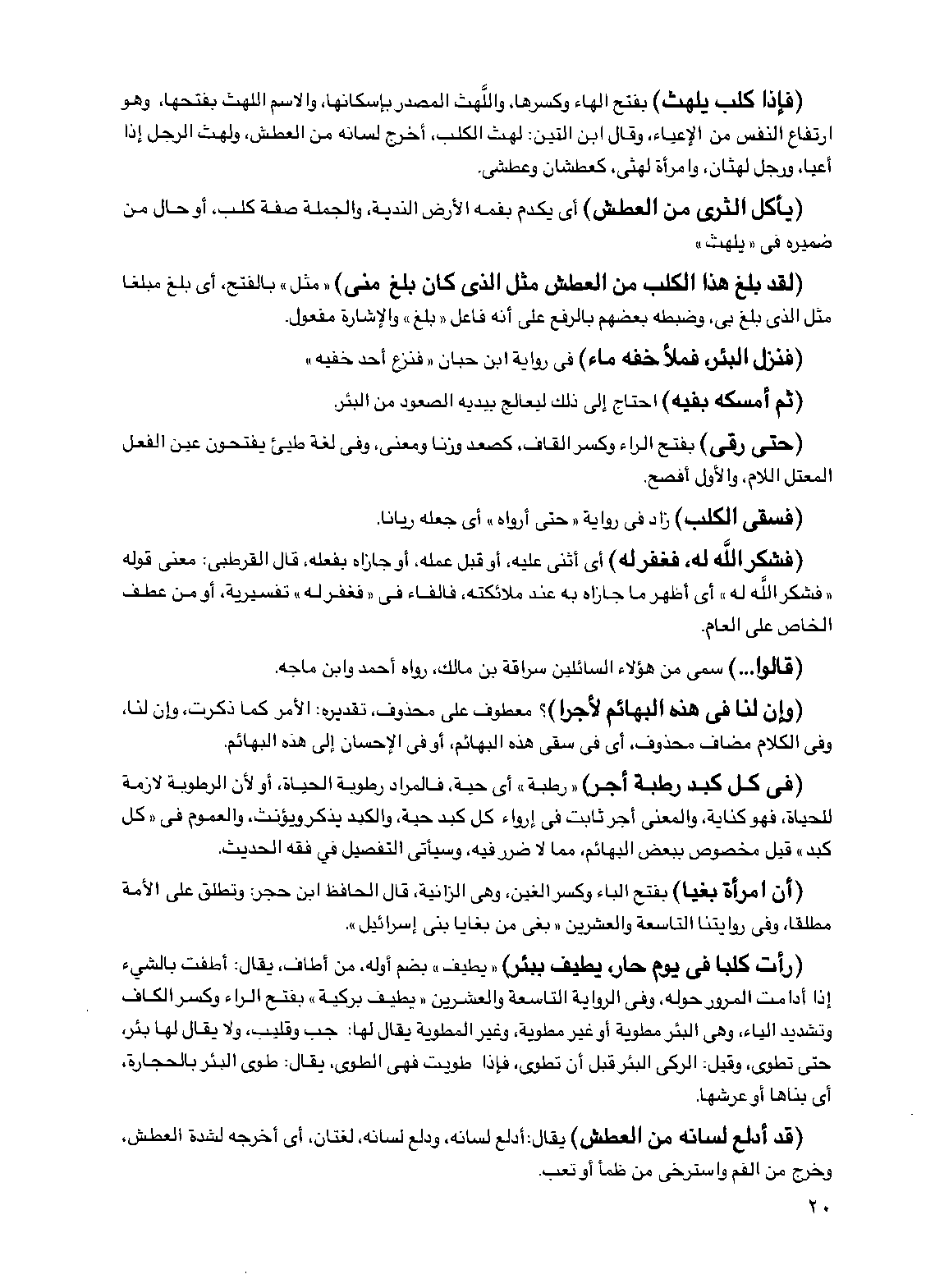 (رأت كلبا في يوم حار، يطيف ببئر) "يطيف" بضم أوله، من أطاف، يقال: أطفت بالشيء إذا أدامت المرور حوله، وفي الرواية التاسعة والعشرين "يطيف بركية" بفتح الراء وكسر الكاف وتشديد الياء، وهي البئر مطوية أو غير مطوية، وغير المطوية يقال لها: جب وقليب، ولا يقال لها بئر، حتى تطوى، وقيل: الركي البئر قبل أن تطوى، فإذا طويت فهي الطوى يقال: طوى البئر بالحجارة، أي بناها أو عرشها.