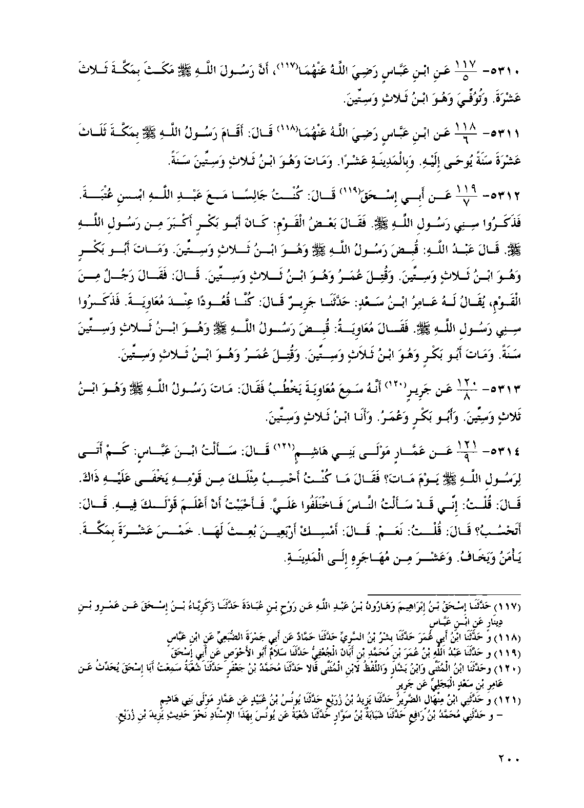 5312 - عن أبي إسحق قال: كنت جالسا مع عبد الله بن عتبة. فذكروا سني رسول الله صلى الله عليه وسلم. فقال بعض القوم: كان أبو بكر أكبر من رسول الله صلى الله عليه وسلم، قال عبد الله: قبض رسول الله صلى الله عليه وسلم وهو ابن ثلاث وستين. ومات أبو بكر وهو ابن ثلاث وستين. وقتل عمر وهو ابن ثلاث وستين. قال: فقال رجل من القوم، يقال له عامر بن سعد: حدثنا جرير قال: كنا قعودا عند معاوية. فذكروا سني رسول الله صلى الله عليه وسلم. فقال معاوية: قبض رسول الله صلى الله عليه وسلم وهو ابن ثلاث وستين سنة. ومات أبو بكر وهو ابن ثلاث وستين. وقتل عمر وهو ابن ثلاث وستين.