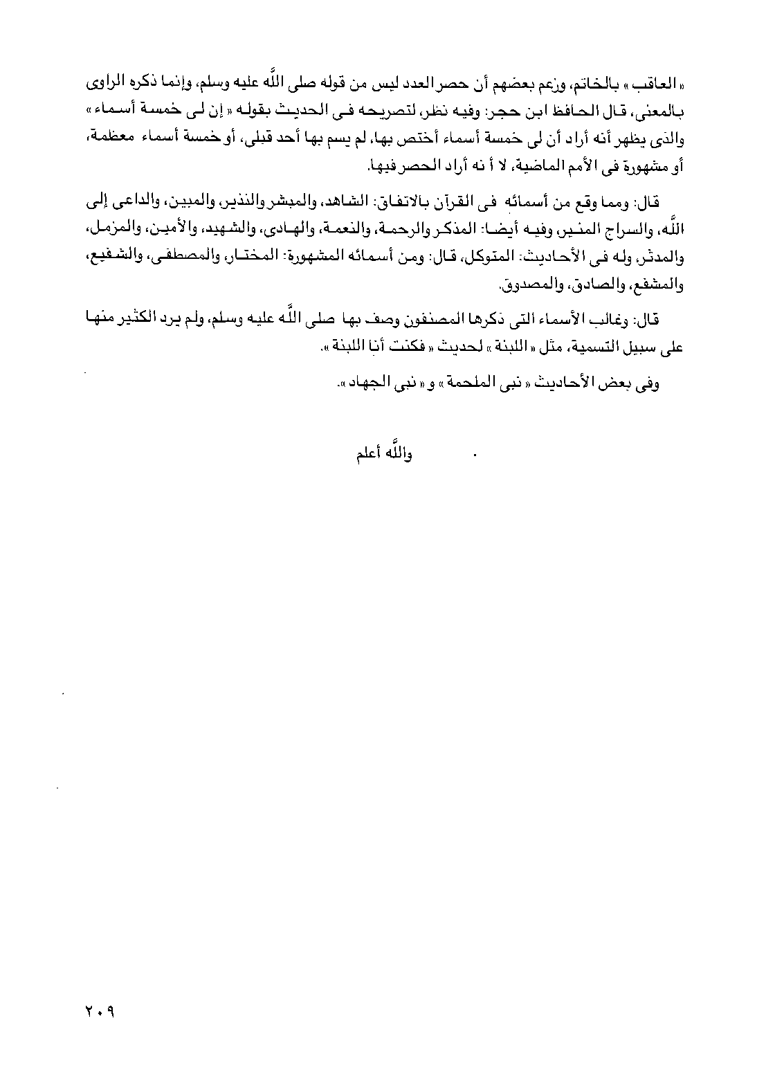قال: وغالب الأسماء التي ذكرها المصنفون وصف بها صلى الله عليه وسلم، ولم يرد الكثير منها على سبيل التسمية، مثل "اللبنة" لحديث "فكنت أنا اللبنة"