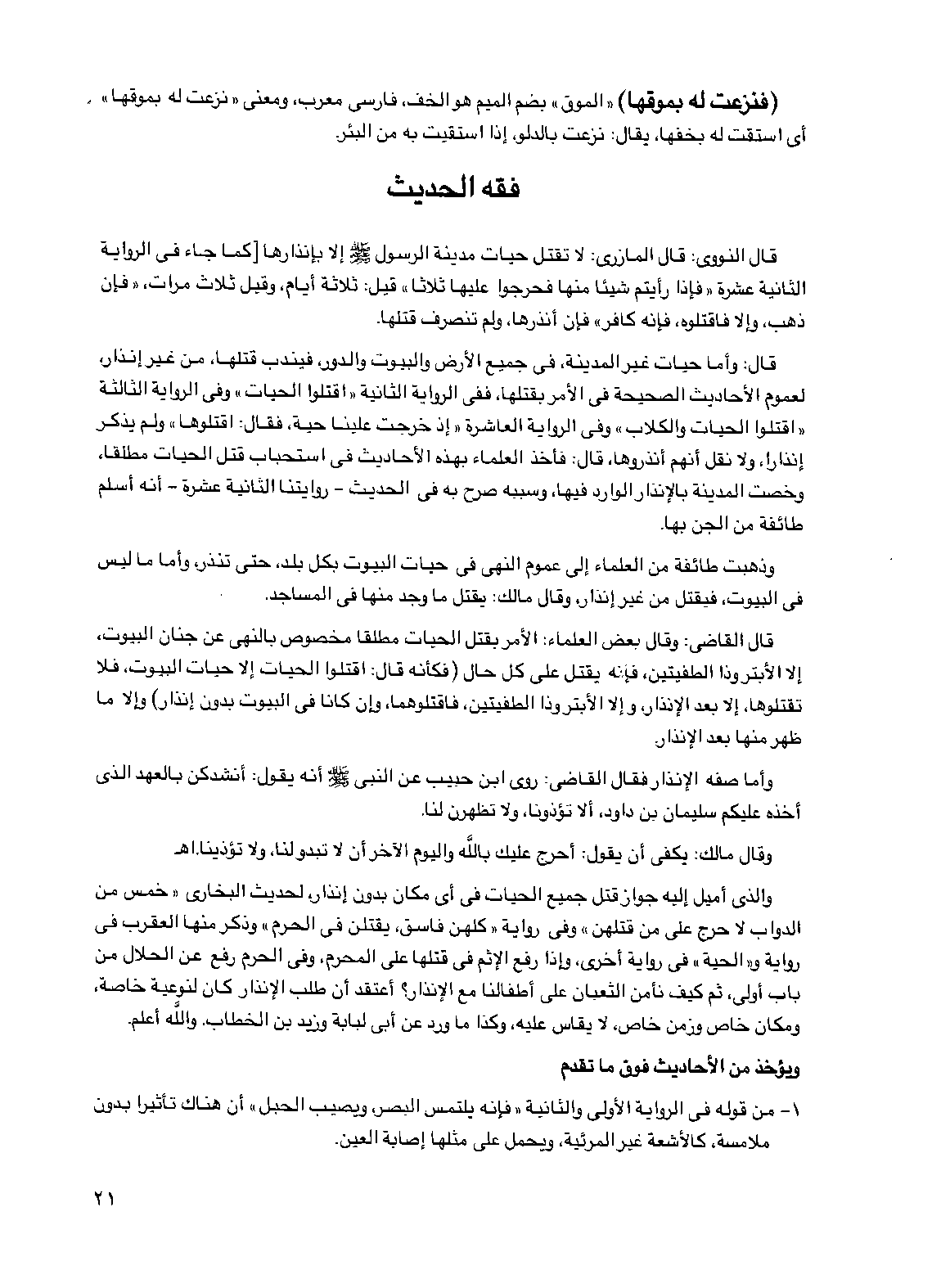 قال النووي: قال المازري: لا تقتل حيات مدينة الرسول صلى الله عليه وسلم إلا بإنذارها [كما جاء في الرواية الثانية عشرة "فإذا رأيتم شيئا منها فحرجوا عليها ثلاثا" قيل: ثلاثة أيام، وقيل ثلاث مرات، "فإن ذهب، وإلا فاقتلوه، فإنه كافر" فإن أنذرها، ولم تنصرف قتلها.