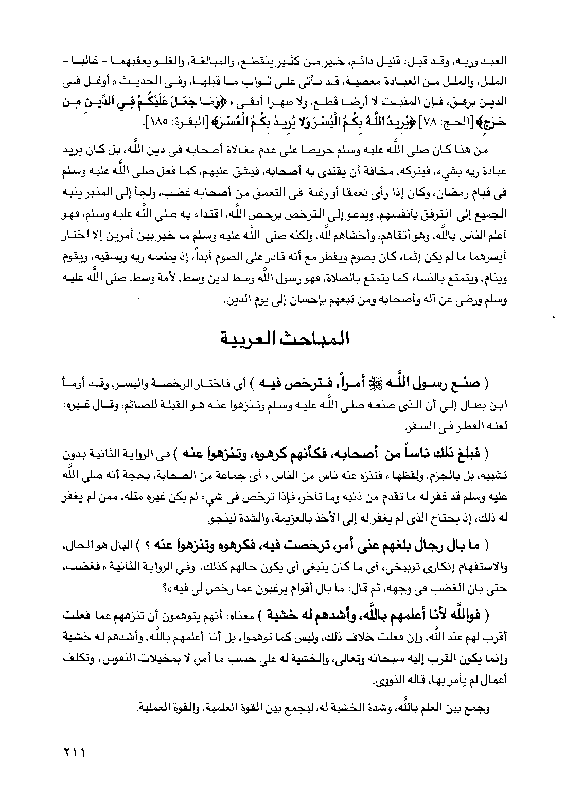 من هنا كان صلى الله عليه وسلم حريصا على عدم مغالاة أصحابه في دين الله، بل كان يريد عبادة ربه بشيء، فيتركه، مخافة أن يقتدي به أصحابه، فيشق عليهم، كما فعل صلى الله عليه وسلم في قيام رمضان، وكان إذا رأى تعمقا أو رغبة في التعمق من أصحابه غضب، ولجأ إلى المنبر ينبه الجميع إلى الترفق بأنفسهم، ويدعو إلى الترخص برخص الله، اقتداء به صلى الله عليه وسلم، فهو أعلم الناس بالله، وهو أتقاهم، وأخشاهم لله، ولكنه صلى الله عليه وسلم ما خير بين أمرين إلا اختار أيسرهما ما لم يكن إثما، كان يصوم ويفطر مع أنه قادر على الصوم أبدا، إذ يطعمه ربه ويسقيه، ويقوم وينام، ويتمتع بالنساء كما يتمتع بالصلاة، فهو رسول الله وسط لدين وسط، لأمة وسط. صلى الله عليه وسلم ورضي عن آله وأصحابه ومن تبعهم بإحسان إلى يوم الدين.