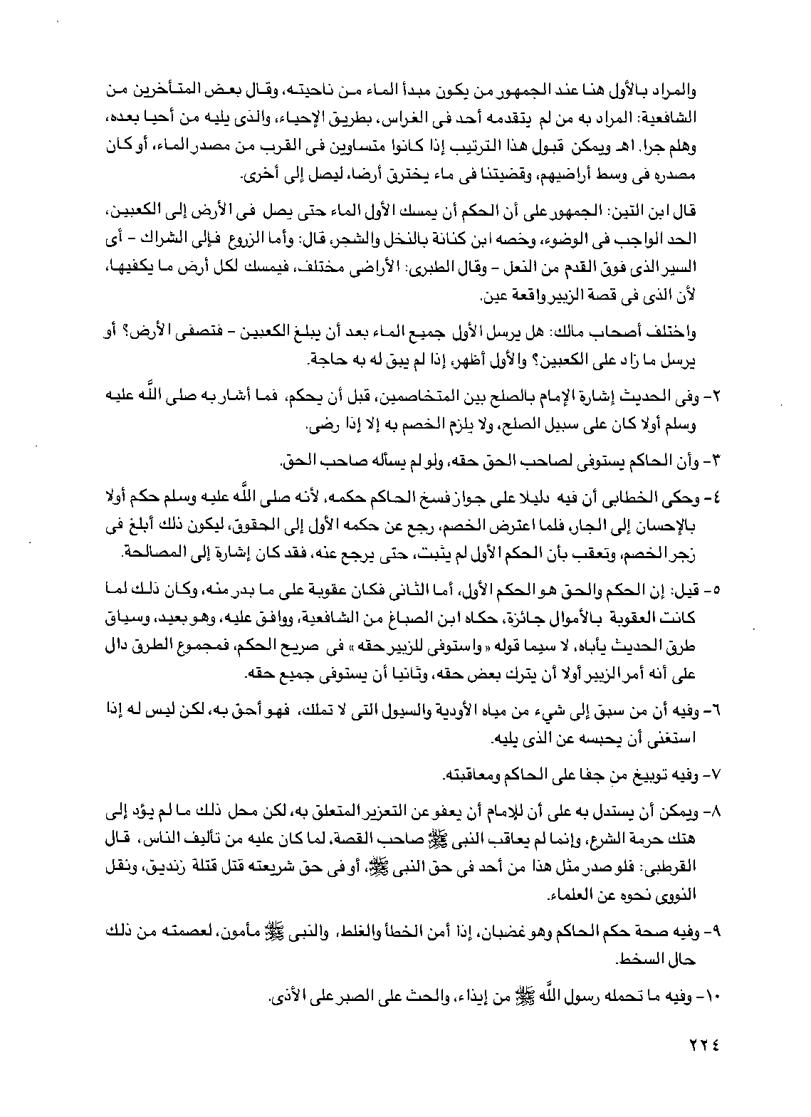 5 - قيل: إن الحكم والحق هو الحكم الأول، أما الثاني فكان عقوبة على ما بدر منه، وكان ذلك لما كانت العقوبة بالأموال جائزة، حكاه ابن الصباغ من الشافعية، ووافق عليه، وهو بعيد، وسياق طرق الحديث يأباه، لا سيما قوله "واستوفى للزبير حقه" في صريح الحكم، فمجموع الطرق دال على أنه أمر الزبير أولا أن يترك بعض حقه، وثانيا أن يستوفي جميع حقه.