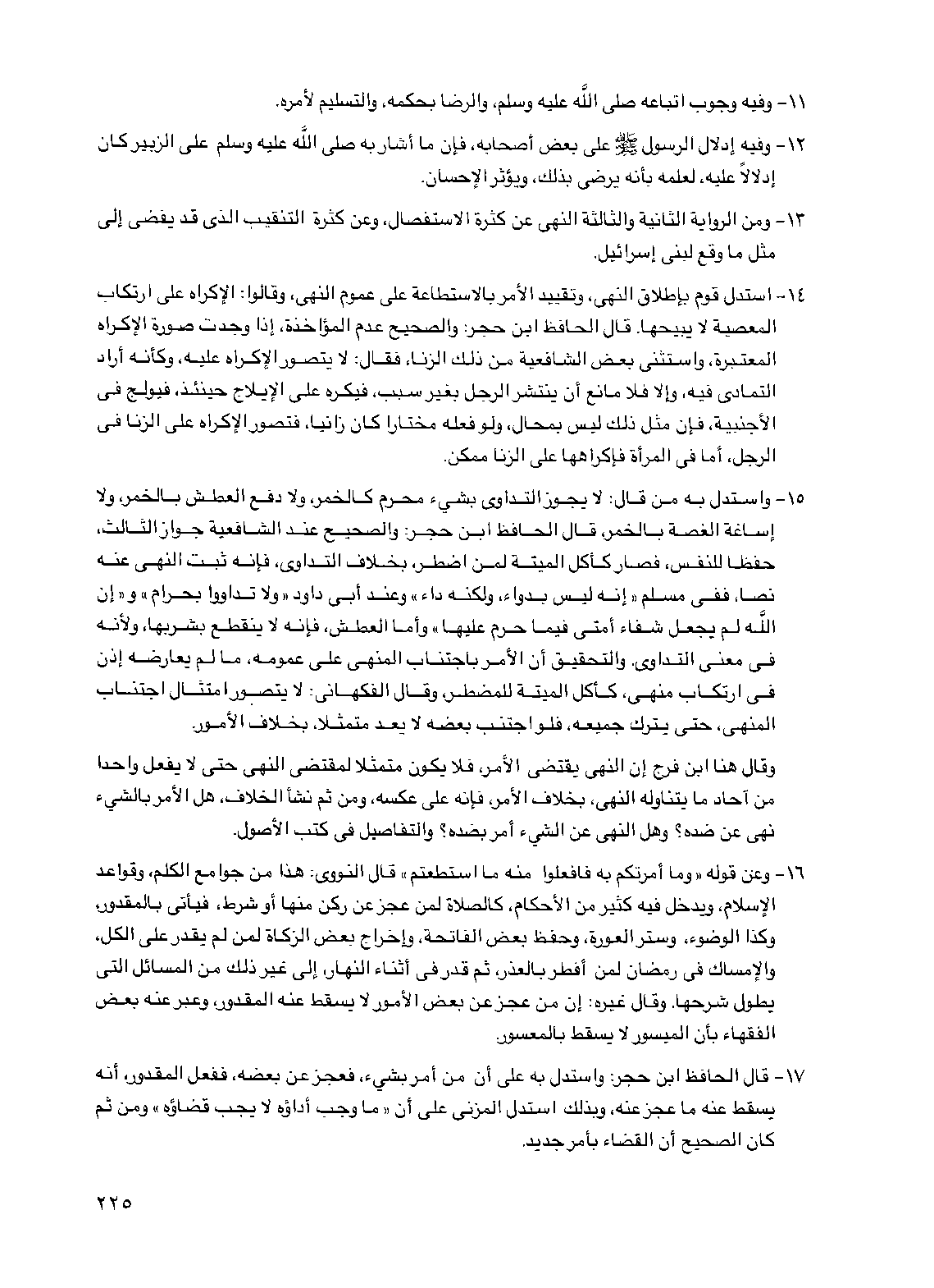 14 - استدل قوم بإطلاق النهي، وتقييد الأمر بالاستطاعة على عموم النهي، وقالوا: الإكراه على ارتكاب المعصية لا يبيحها، قال الحافظ ابن حجر: والصحيح عدم المؤاخذة، إذا وجدت صورة الإكراه المعتبرة، واستثنى بعض الشافعية من ذلك الزنا، فقال: لا يتصور الإكراه عليه، وكأنه أراد التمادي فيه، وإلا فلا مانع أن ينتشر الرجل بغير سبب، فيكره على الإيلاج حينئذ، فيولج في الأجنبية، فإن مثل ذلك ليس بمحال، ولو فعله مختارا كان زانيا، فتصور الإكراه على الزنا في الرجل، أما في المرأة فإكراهها على الزنا ممكن.