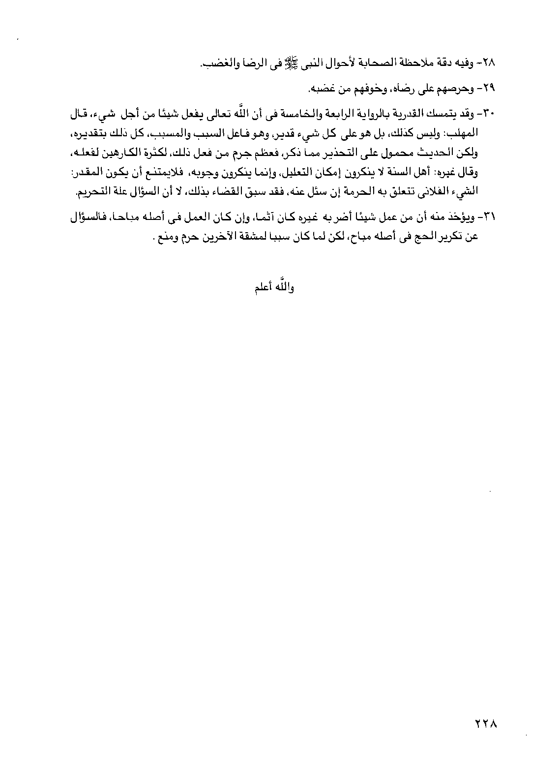 30 - وقد يتمسك القدرية بالرواية الرابعة والخامسة في أن الله تعالى يفعل شيئا من أجل شيء، قال المهلب: وليس كذلك، بل هو على كل شيء قدير، وهو فاعل السبب والمسبب، كل ذلك بتقديره، ولكن الحديث محمول على التحذير مما ذكر، فعظم جرم من فعل ذلك، لكثرة الكارهين لفعله، وقال غيره: أهل السنة لا ينكرون إمكان التعليل، وإنما ينكرون وجوبه، فلا يمتنع أن يكون المقدر: الشيء الفلاني تتعلق به الحرمة إن سئل عنه، فقد سبق القضاء بذلك، لا أن السؤال علة التحريم.