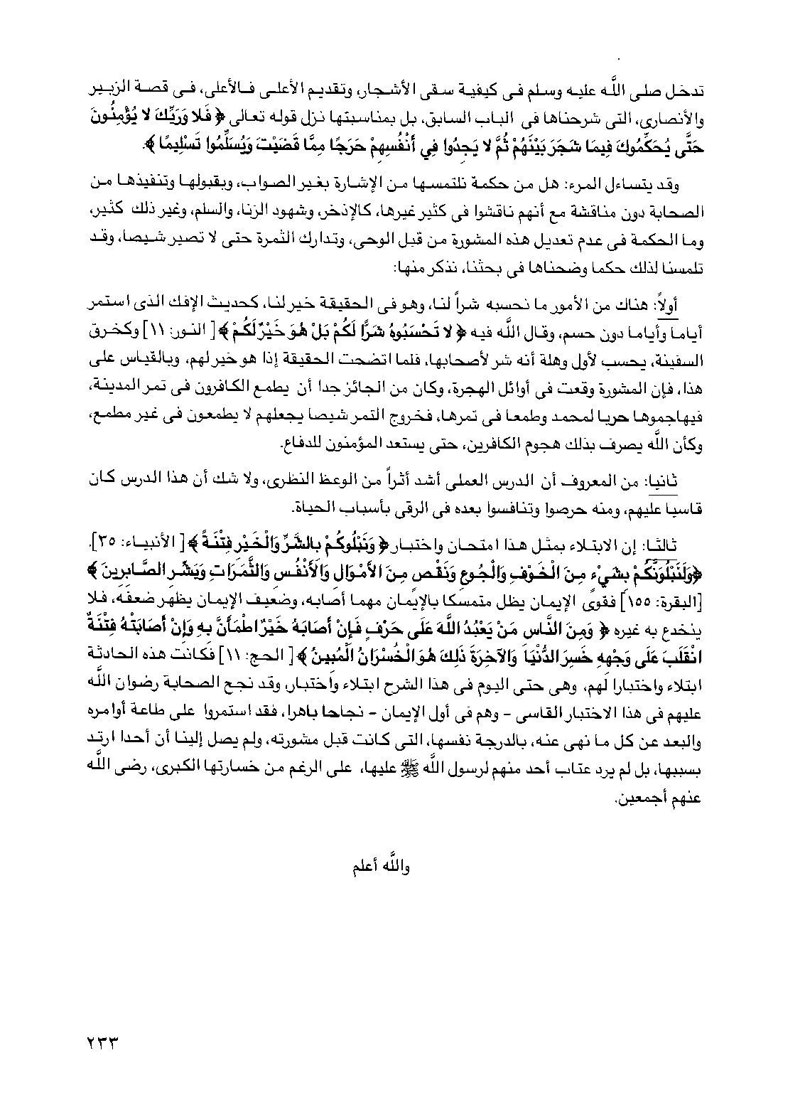 ثالثا: إن الابتلاء بمثل هذا امتحان واختبار {ونبلوكم بالشر والخير فتنة} [الأنبياء: 35] {ولنبلونكم بشيء من الخوف والجوع ونقص من الأموال والأنفس والثمرات وبشر الصابرين} [البقرة: 155] فقوي الإيمان يظل متمسكا بالإيمان مهما أصابه، وضعيف الإيمان يظهر ضعفه. فلا ينخدع به غيره {ومن الناس من يعبد الله على حرف فإن أصابه خير اطمأن به وإن أصابته فتنة انقلب على وجهه خسر الدنيا والآخرة ذلك هو الخسران المبين} [الحج: 11] فكانت هذه الحادثة ابتلاء واختبارا لهم، وهي حتى اليوم في هذا الشرح ابتلاء واختبار، وقد نجح الصحابة رضوان الله عليهم في هذا الاختبار القاسي - وهم في أول الإيمان - نجاحا باهرا، فقد استمروا على طاعة أوامره والبعد عن كل ما نهى عنه، بالدرجة نفسها، التي كانت قبل مشورته، ولم يصل إلينا أن أحدا ارتد بسببها، بل لم يرد عتاب أحد منهم لرسول الله صلى الله عليه وسلم عليها، على الرغم من خسارتها الكبرى، رضي الله عنهم أجمعين.