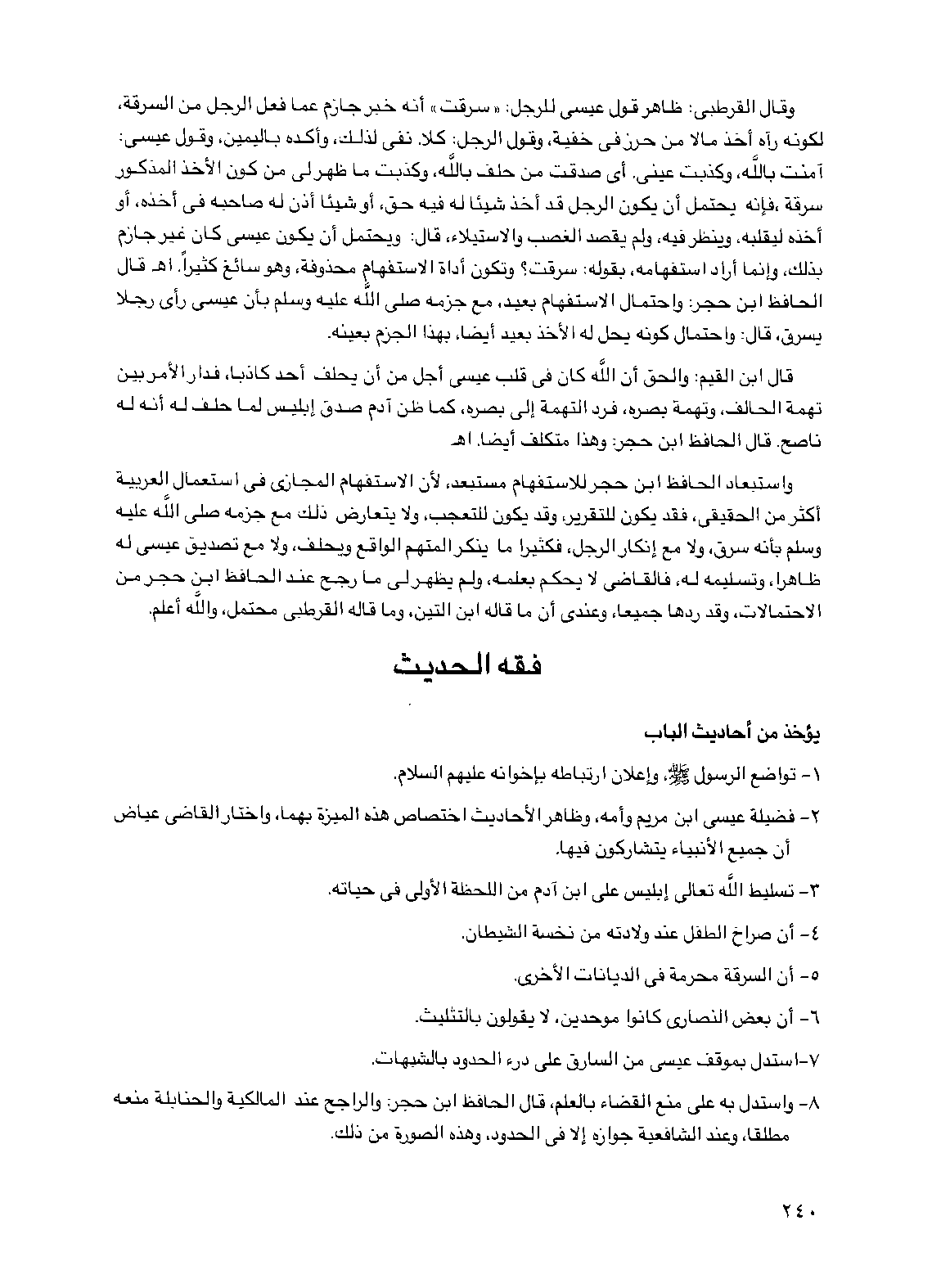 واستبعاد الحافظ ابن حجر للاستفهام مستبعد، لأن الاستفهام المجازي في استعمال العربية أكثر من الحقيقي، فقد يكون للتقرير، وقد يكون للتعجب، ولا يتعارض ذلك مع جزمه صلى الله عليه وسلم بأنه سرق، ولا مع إنكار الرجل، فكثيرا ما ينكر المتهم الواقع ويحلف، ولا مع تصديق عيسى له ظاهرا، وتسليمه له، فالقاضي لا يحكم بعلمه، ولم يظهر لي ما رجح عند الحافظ ابن حجر من الاحتمالات، وقد ردها جميعا، وعندي أن ما قاله ابن التين، وما قاله القرطبي محتمل، والله أعلم.