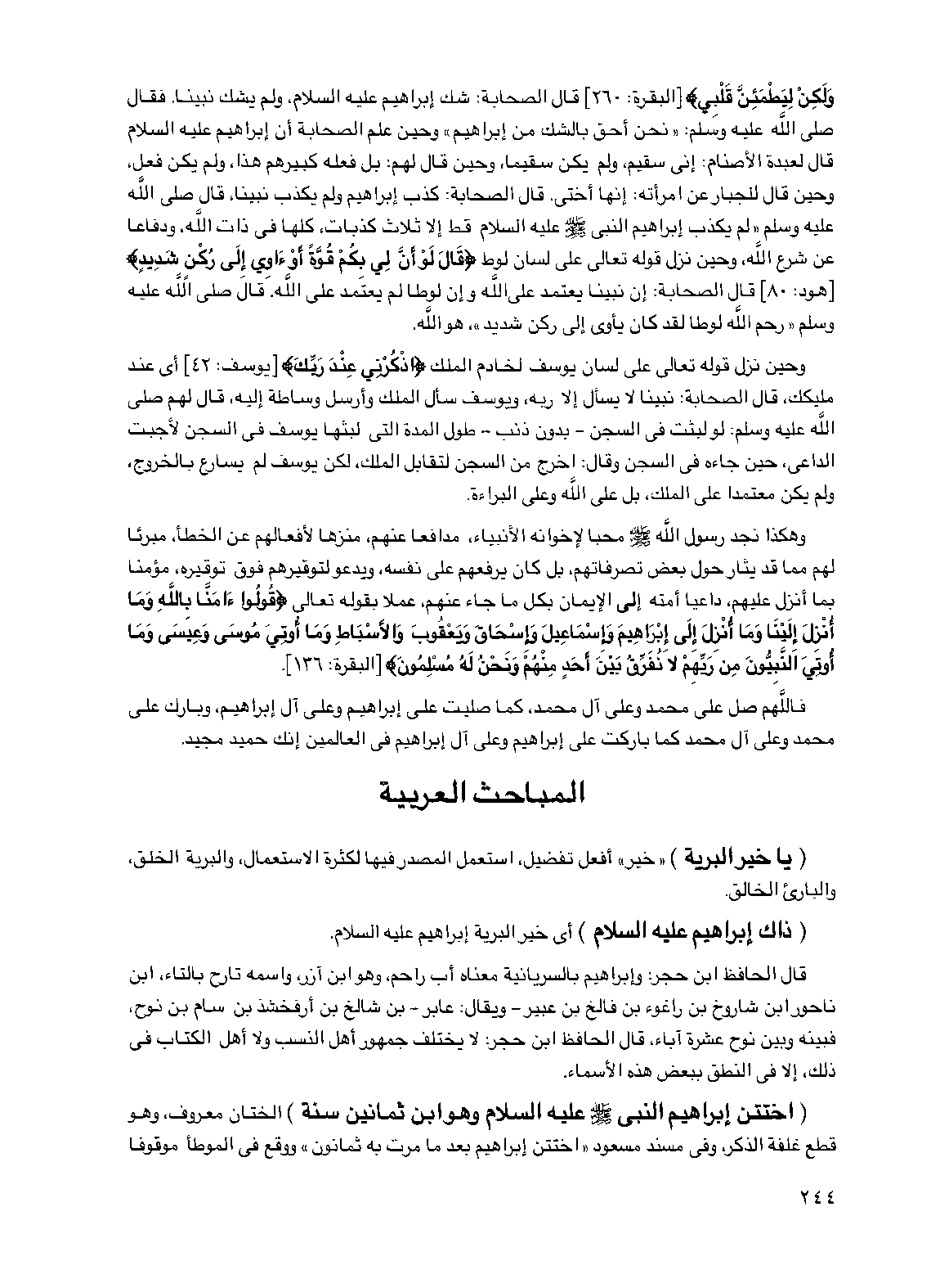 ولكن ليطمئن قلبي} [البقرة: 260] قال الصحابة: شك إبراهيم عليه السلام، ولم يشك نبينا، فقال صلى الله عليه وسلم: "نحن أحق بالشك من إبراهيم" وحين علم الصحابة أن إبراهيم عليه السلام قال لعبدة الأصنام: إني سقيم، ولم يكن سقيما، وحين قال لهم: بل فعله كبيرهم هذا، ولم يكن فعل، وحين قال للجبار عن امرأته: إنها أختي. قال الصحابة: كذب إبراهيم ولم يكذب نبينا، قال صلى الله عليه وسلم "لم يكذب إبراهيم النبي صلى الله عليه وسلم عليه السلام قط إلا ثلاث كذبات، كلها في ذات الله، ودفاعا عن شرع الله، وحين نزل قوله تعالى على لسان لوط {قال لو أن لي بكم قوة أو ءاوي إلى ركن شديد} [هود: 80] قال الصحابة: إن نبينا يعتمد على الله وإن لوطا لم يعتمد على الله. قال صلى الله عليه وسلم "رحم الله لوطا لقد كان يأوي إلى ركن شديد"، هو الله.