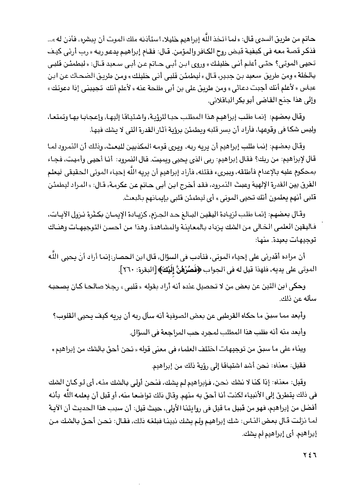 حاتم من طريق السدي قال: "لما اتخذ الله إبراهيم خليلا، استأذنه ملك الموت أن يبشره، فأذن له" ... فذكر قصة معه في كيفية قبض روح الكافر والمؤمن. قال: فقام إبراهيم يدعو ربه "رب أرني كيف تحيي الموتى؟ حتى أعلم أني خليلك" وروى ابن أبي حاتم عن أبي سعيد قال: "ليطمئن قلبي بالخلة" ومن طريق سعيد بن جبير، قال "ليطمئن قلبي أني خليلك" ومن طريق الضحاك عن ابن عباس "لأعلم أنك أجبت دعائي" ومن طريق علي بن أبي طلحة عنه "لأعلم أنك تجيبني إذا دعوتك" وإلى هذا جنح القاضي أبو بكر الباقلاني.