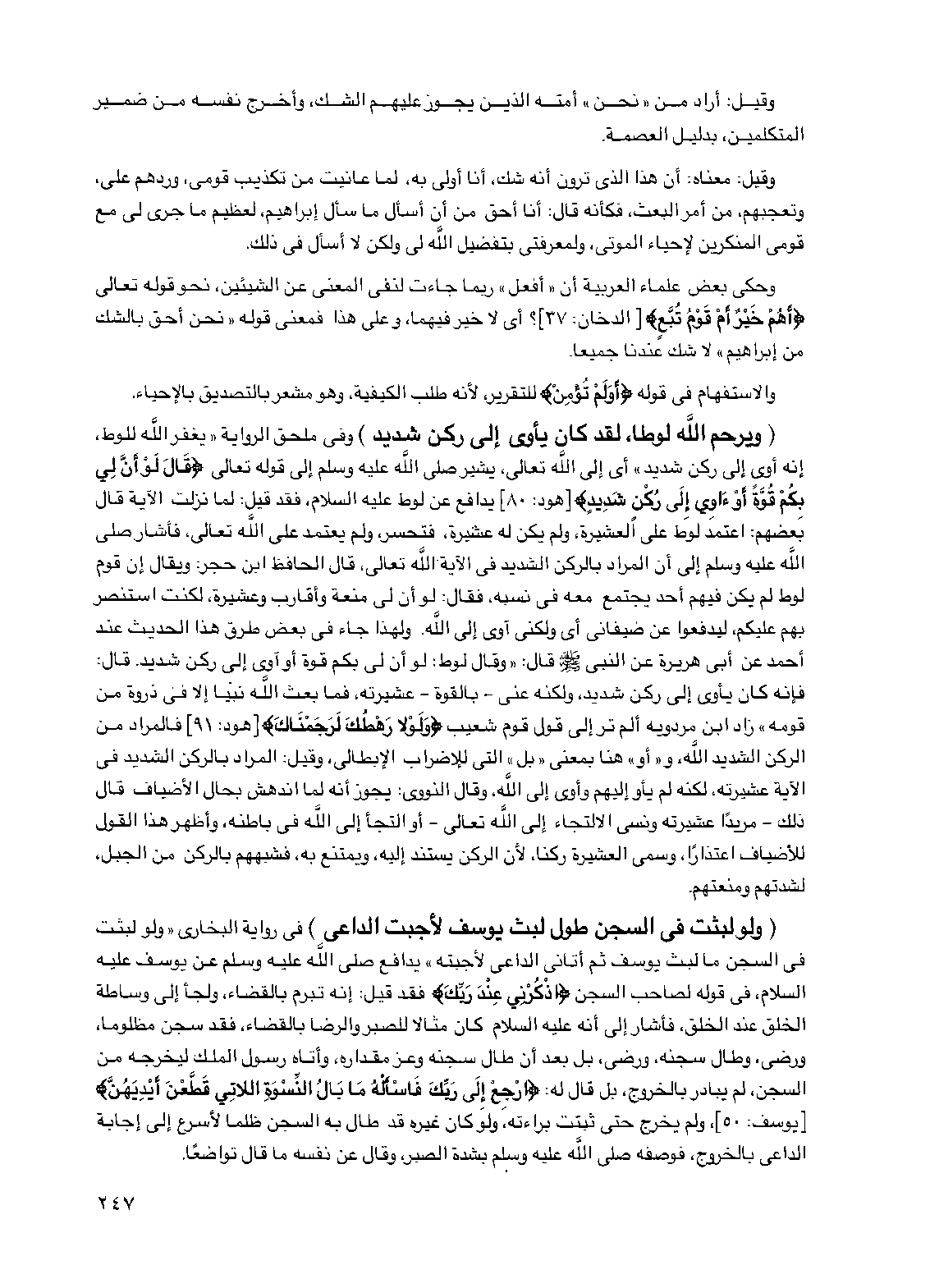 (ويرحم الله لوطا، لقد كان يأوي إلى ركن شديد) وفي ملحق الرواية "يغفر الله للوط، إنه أوى إلى ركن شديد" أي إلى الله تعالى، يشير صلى الله عليه وسلم إلى قوله تعالى {قال لو أن لي بكم قوة أو ءاوي إلى ركن شديد} [هود: 80] يدافع عن لوط عليه السلام، فقد قيل: لما نزلت الآية قال بعضهم: اعتمد لوط على العشيرة، ولم يكن له عشيرة، فتحسر، ولم يعتمد على الله تعالى، فأشار صلى الله عليه وسلم إلى أن المراد بالركن الشديد في الآية الله تعالى، قال الحافظ ابن حجر: ويقال إن قوم لوط لم يكن فيهم أحد يجتمع معه في نسبه، فقال: لو أن لي منعة وأقارب وعشيرة، لكنت أستنصر بهم عليكم، ليدفعوا عن ضيفاني أي ولكني آوي إلى الله. ولهذا جاء في بعض طرق هذا الحديث عند أحمد عن أبي هريرة عن النبي صلى الله عليه وسلم قال: "وقال لوط: لو أن لي بكم قوة أو آوي إلى ركن شديد. قال: فإنه كان يأوي إلى ركن شديد، ولكنه عنى - بالقوة - عشيرته، فما بعث الله نبيا إلا في ذروة من قومه" زاد ابن مردويه ألم تر إلى قول قوم شعيب {ولولا رهطك لرجمناك} [هود: 91] فالمراد من الركن الشديد الله، و"أو" هنا بمعنى "بل" التي للإضراب الإبطالي، وقيل: المراد بالركن الشديد في الآية عشيرته، لكنه لم يأو إليهم وأوى إلى الله، وقال النووي: يجوز أنه لما اندهش بحال الأضياف قال ذلك - مريدا عشيرته ونسي الالتجاء إلى الله تعالى - أو التجأ إلى الله في باطنه، وأظهر هذا القول للأضياف اعتذارا، وسمى العشيرة ركنا، لأن الركن يستند إليه، ويمتنع به، فشبههم بالركن من الجبل، لشدتهم ومنعتهم.