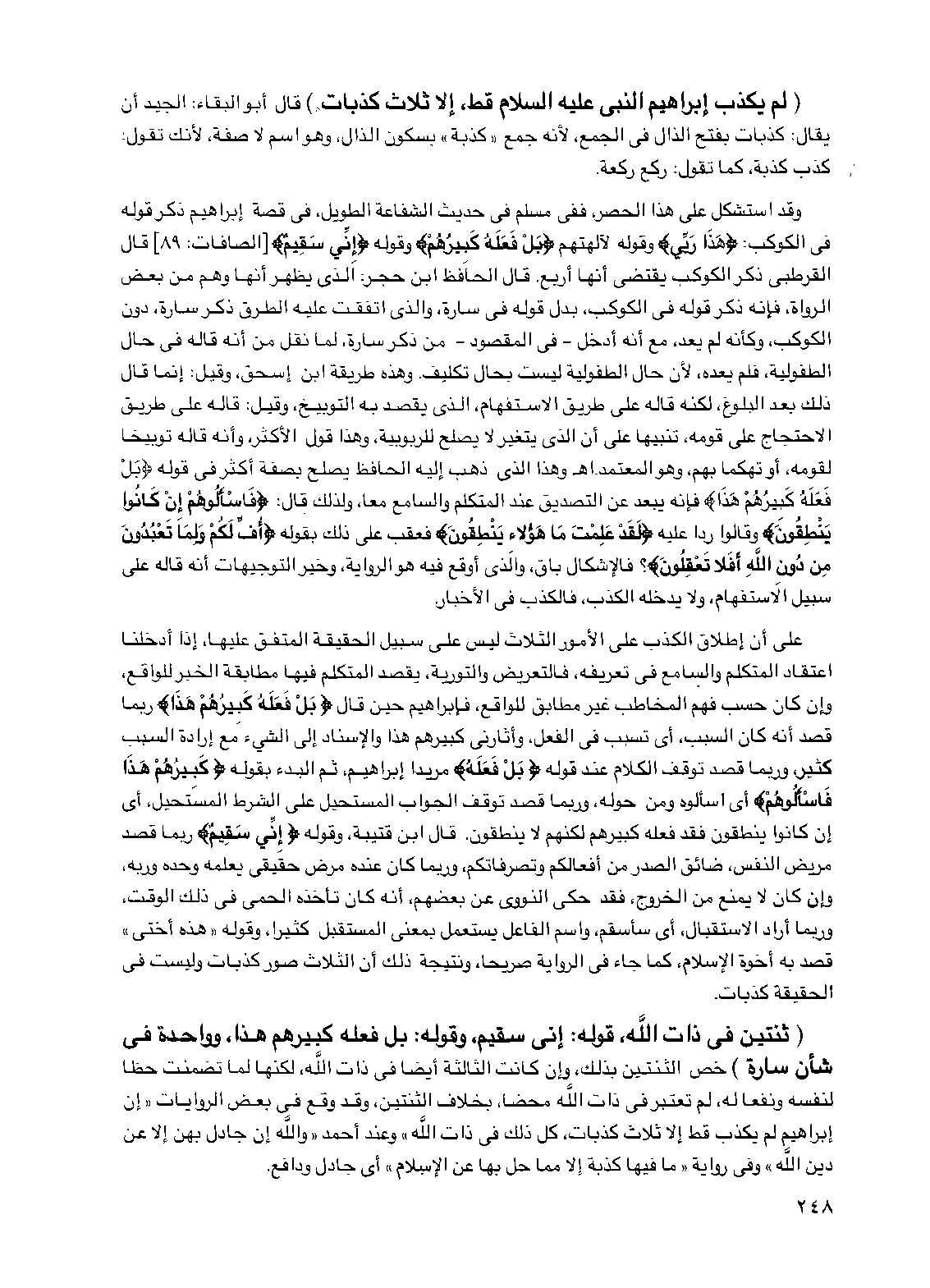 على أن إطلاق الكذب على الأمور الثلاث ليس على سبيل الحقيقة المتفق عليها، إذا أدخلنا اعتقاد المتكلم والسامع في تعريفه، فالتعريض والتورية، يقصد المتكلم فيها مطابقة الخبر للواقع، وإن كان حسب فهم المخاطب غير مطابق للواقع، فإبراهيم حين قال {بل فعله كبيرهم هذا} ربما قصد أنه كان السبب، أي تسبب في الفعل، وأثارني كبيرهم هذا والإسناد إلى الشيء مع إرادة السبب كثير، وربما قصد توقف الكلام عند قوله {بل فعله} مريدا إبراهيم، ثم البدء بقوله {كبيرهم هذا فاسألوهم} أي اسألوه ومن حوله، وربما قصد توقف الجواب المستحيل على الشرط المستحيل، أي إن كانوا ينطقون فقد فعله كبيرهم لكنهم لا ينطقون. قال ابن قتيبة، وقوله {إني سقيم} ربما قصد مريض النفس، ضائق الصدر من أفعالكم وتصرفاتكم، وربما كان عنده مرض حقيقي يعلمه وحده وربه، وإن كان لا يمنع من الخروج، فقد حكى النووي عن بعضهم، أنه كان تأخذه الحمى في ذلك الوقت، وربما أراد الاستقبال، أي سأسقم، واسم الفاعل يستعمل بمعنى المستقبل كثيرا، وقوله "هذه أختي" قصد به أخوة الإسلام، كما جاء في الرواية صريحا، ونتيجة ذلك أن الثلاث صور كذبات وليست في الحقيقة كذبات.
