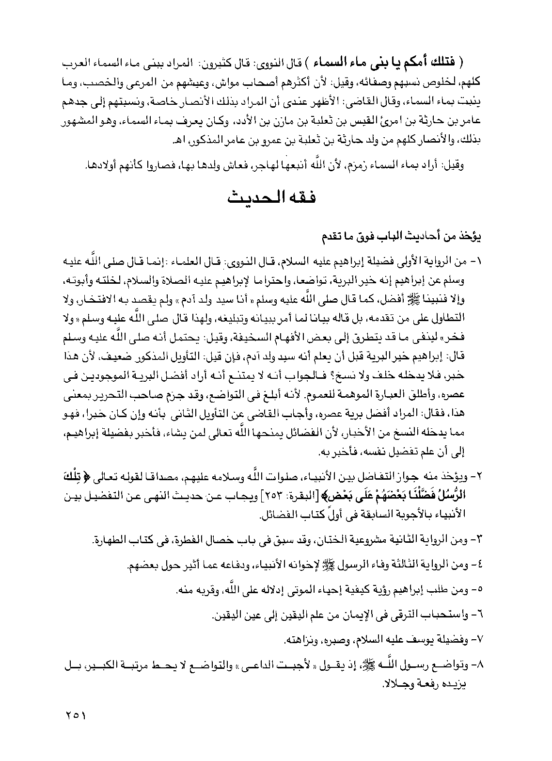 2 - ويؤخذ منه جواز التفاضل بين الأنبياء، صلوات الله وسلامه عليهم، مصداقا لقوله تعالى {تلك الرسل فضلنا بعضهم على بعض} [البقرة: 253] ويجاب عن حديث النهي عن التفضيل بين الأنبياء بالأجوبة السابقة في أول كتاب الفضائل.
