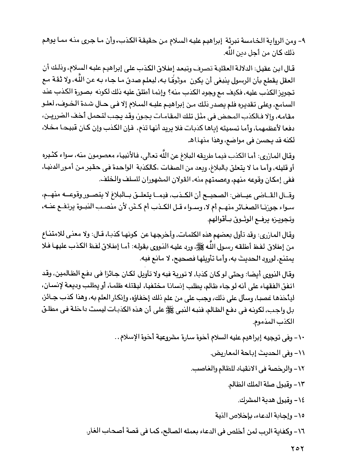 9 - ومن الرواية الخامسة تبرئة إبراهيم عليه السلام من حقيقة الكذب، وأن ما جرى منه مما يوهم ذلك كان من أجل دين الله.