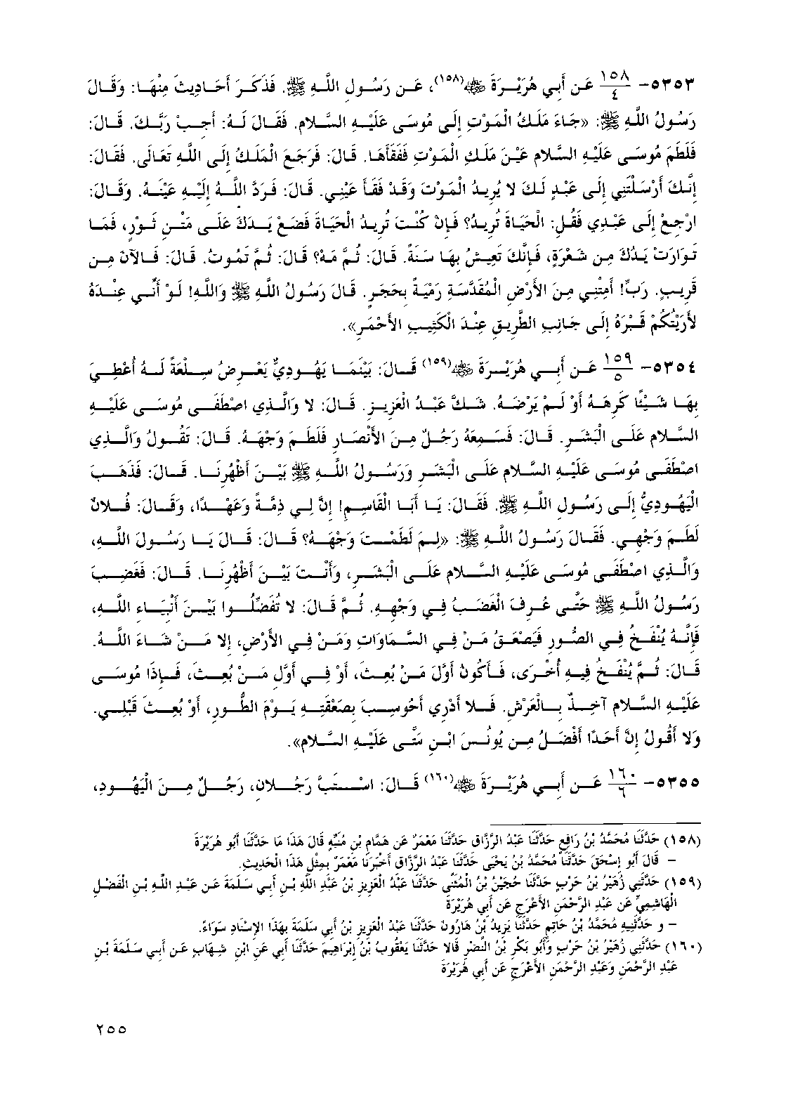 5354 - عن أبي هريرة رضي الله عنه قال: بينما يهودي يعرض سلعة له أعطي بها شيئا كرهه أو لم يرضه. شك عبد العزيز. قال: لا والذي اصطفى موسى عليه السلام على البشر. قال: فسمعه رجل من الأنصار فلطم وجهه. قال: تقول والذي اصطفى موسى عليه السلام على البشر ورسول الله صلى الله عليه وسلم بين أظهرنا. قال: فذهب اليهودي إلى رسول الله صلى الله عليه وسلم. فقال: يا أبا القاسم! إن لي ذمة وعهدا، وقال: فلان لطم وجهي. فقال رسول الله صلى الله عليه وسلم: "لم لطمت وجهه؟ قال: قال يا رسول الله والذي اصطفى موسى عليه السلام على البشر، وأنت بين أظهرنا. قال: فغضب رسول الله صلى الله عليه وسلم حتى عرف الغضب في وجهه. ثم قال: لا تفضلوا بين أنبياء الله، فإنه ينفخ في الصور فيصعق من في السماوات ومن في الأرض، إلا من شاء الله. قال: ثم ينفخ فيه أخرى، فأكون أول من بعث، أو في أول من بعث، فإذا موسى عليه السلام آخذ بالعرش. فلا أدري أحوسب بصعقته يوم الطور، أو بعث قبلي. ولا أقول إن أحدا أفضل من يونس ابن متى عليه السلام".