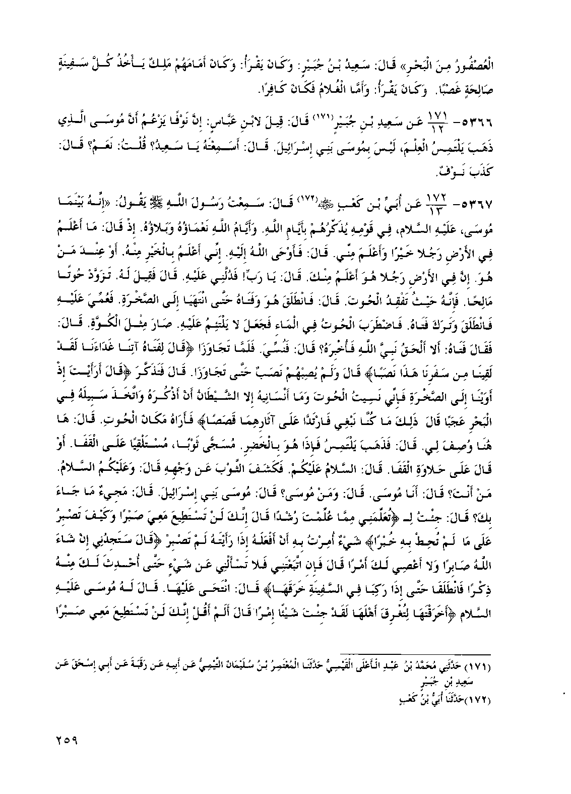 5366 - عن سعيد بن جبير قال: قيل لابن عباس: إن نوفا يزعم أن موسى الذي ذهب يلتمس العلم، ليس بموسى بني إسرائيل. قال: أسمعته يا سعيد؟ قلت: نعم؟ قال: كذب نوف.