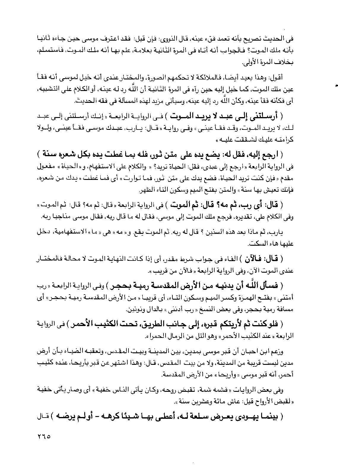 (أرسلتني إلى عبد لا يريد الموت) في الرواية الرابعة "إنك أرسلتني إلى عبد لك، لا يريد الموت، وقد فقأ عيني" وفي رواية "قال: يا رب، عبدك موسى فقأ عيني، ولولا كرامته عليك لشققت عليه"