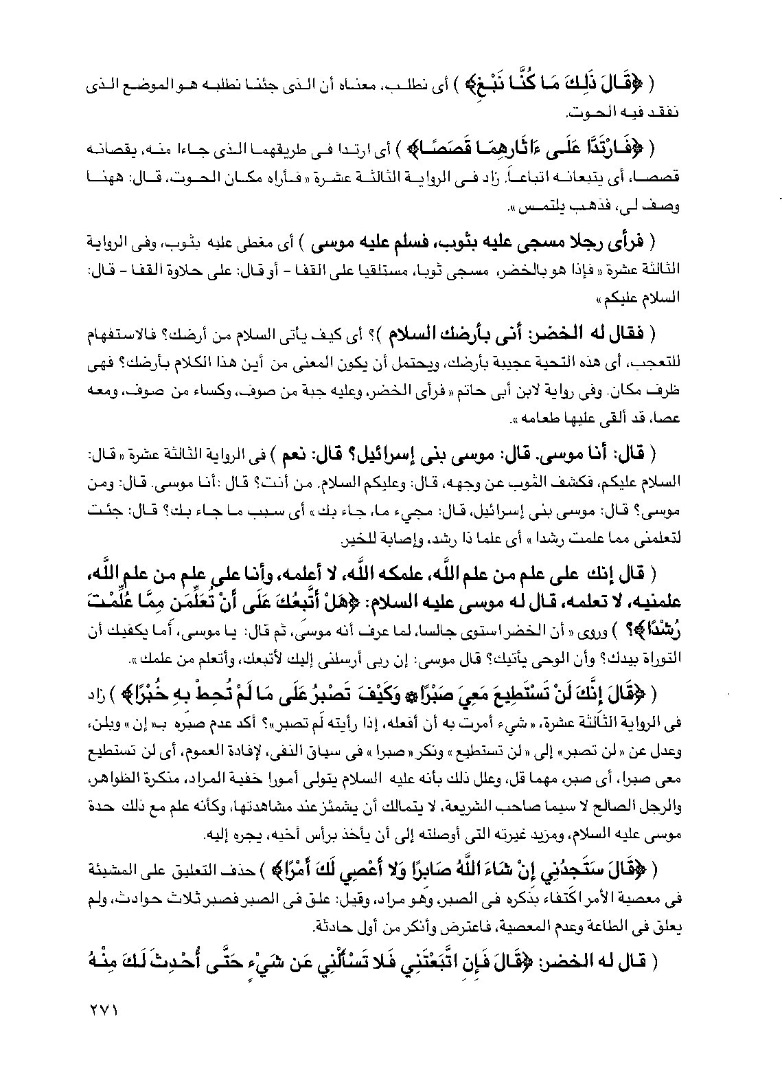 ({فارتدا على آثارهما قصصا}) أي ارتدا في طريقهما الذي جاءا منه، يقصانه قصصا، أي يتبعانه اتباعا، زاد في الرواية الثالثة عشرة "فأراه مكان الحوت، قال: ها هنا وصف لي، فذهب يلتمس".