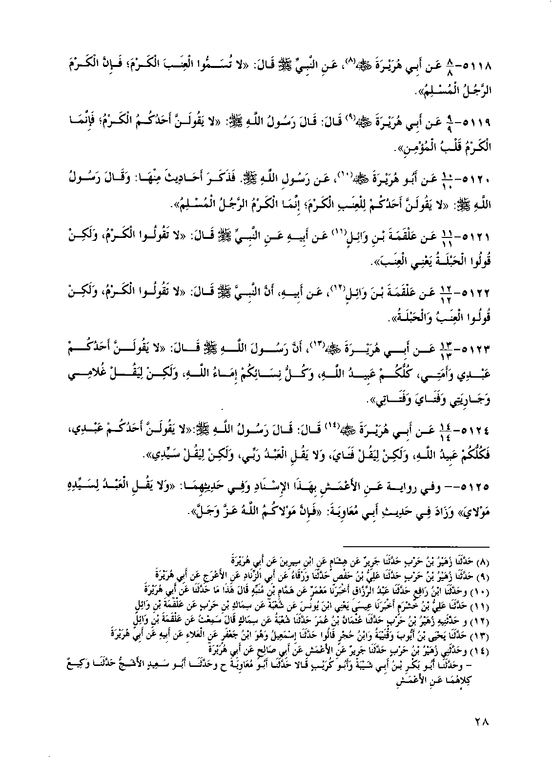 5118 - عن أبي هريرة رضي الله عنه، عن النبي صلى الله عليه وسلم قال: "لا تسموا العنب الكرم، فإن الكرم الرجل المسلم".