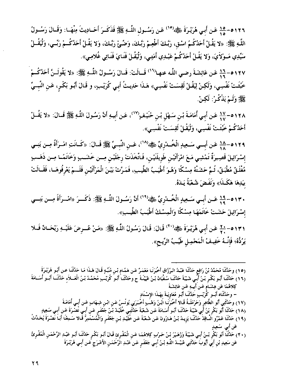5126 - عن أبي هريرة رضي الله عنه، عن رسول الله صلى الله عليه وسلم فذكر أحاديث منها: وقال رسول الله صلى الله عليه وسلم: "لا يقل أحدكم اسق، ربك أطعم ربك، وضئ ربك، ولا يقل أحدكم ربي، وليقل سيدي مولاي، ولا يقل أحدكم عبدي أمتي، وليقل فتاي فتاتي غلامي".
