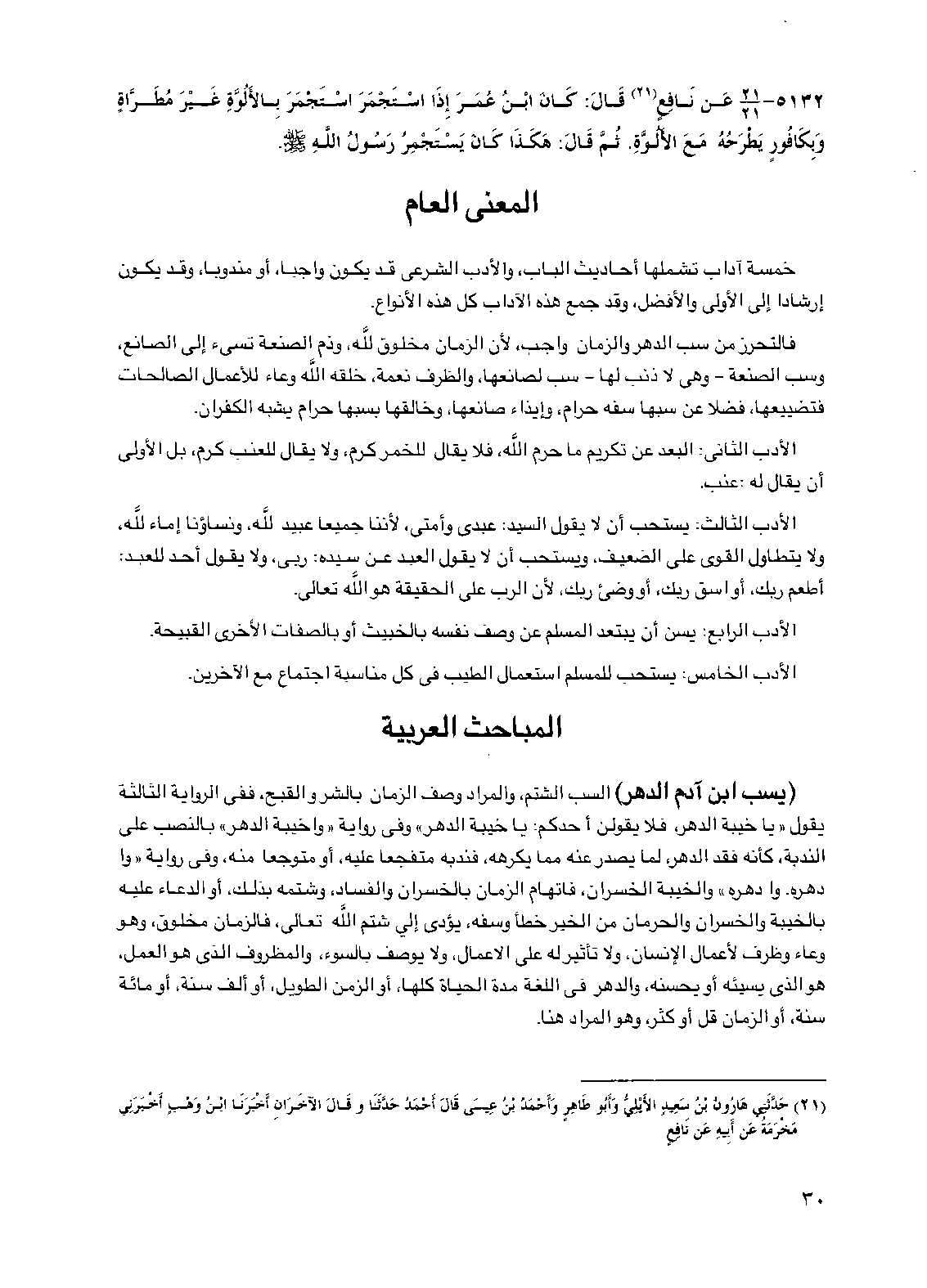 خمسة آداب تشملها أحاديث الباب، والأدب الشرعي قد يكون واجبا، أو مندوبا، وقد يكون إرشادا إلى الأولى والأفضل، وقد جمع هذه الآداب كل هذه الأنواع.