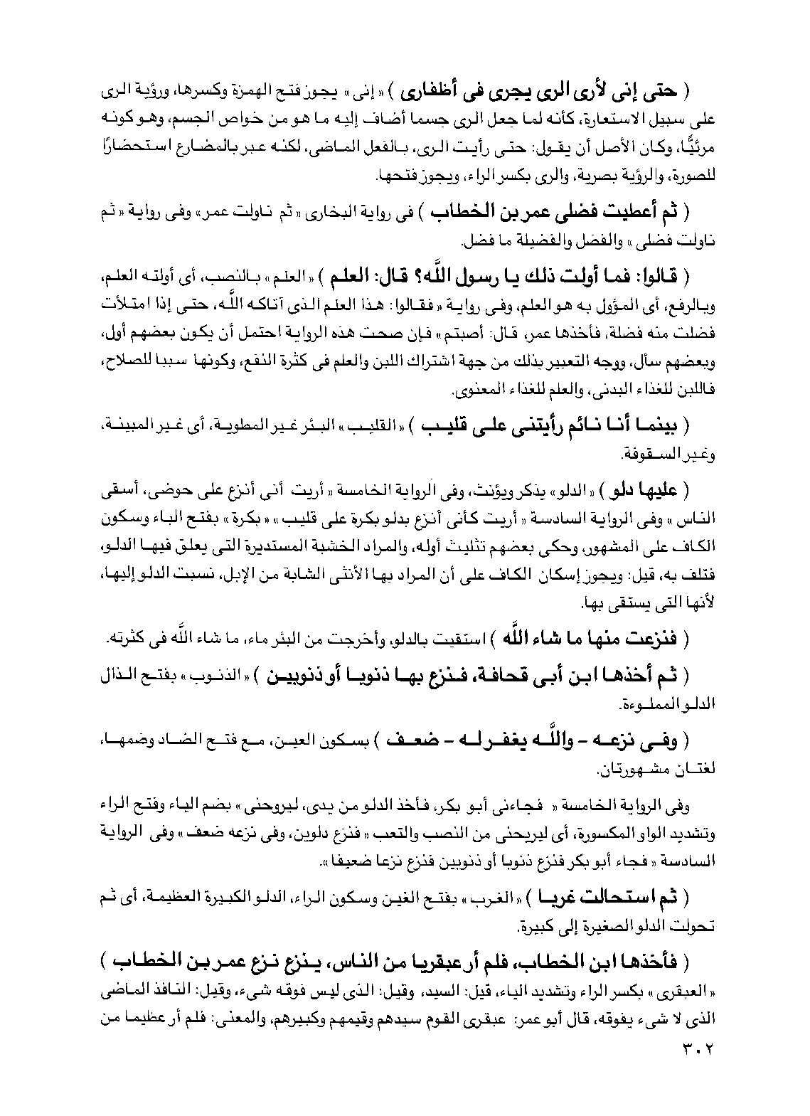 (فأخذها ابن الخطاب، فلم أر عبقريا من الناس، ينزع نزع عمر بن الخطاب) "العبقري" بكسر الراء وتشديد الياء، قيل: السيد، وقيل: الذي ليس فوقه شيء، وقيل: النافذ الماضي الذي لا شيء يفوقه، قال أبو عمر: عبقري القوم سيدهم وقيمهم وكبيرهم، والمعنى: فلم أر عظيما من