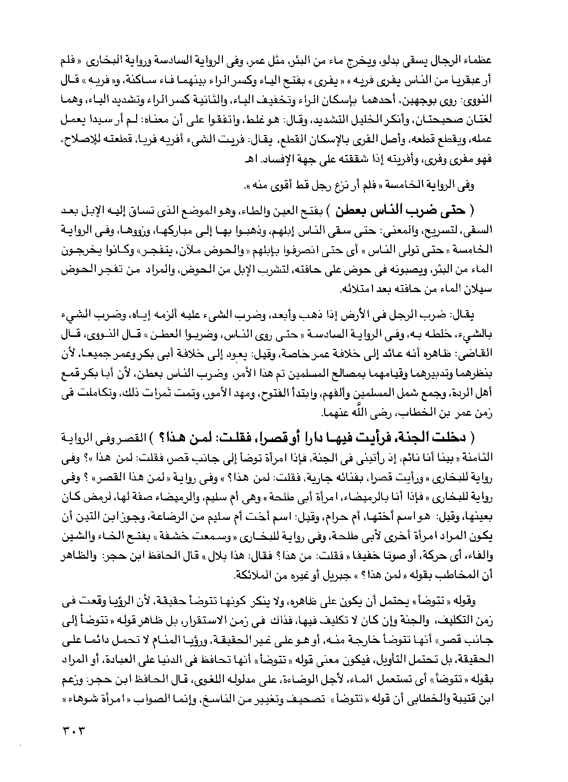 يقال: ضرب الرجل في الأرض إذا ذهب وأبعد، وضرب الشيء عليه ألزمه إياه، وضرب الشيء بالشيء خلطه به، وفي الرواية السادسة "حتى روي الناس وضربوا العطن" قال النووي قال القاضي: ظاهره أنه عائد إلى خلافة عمر خاصة، وقيل: يعود إلى خلافة أبي بكر وعمر جميعا، لأن بنظرهما وتدبيرهما وقيامهما بمصالح المسلمين تم هذا الأمر، وضرب الناس بعطن لأن أبا بكر قمع أهل الردة، وجمع شمل المسلمين وألفهم وابتدأ الفتوح ومهد الأمور وتمت ثمرات ذلك، وتكاملت في زمن عمر بن الخطاب رضي الله عنهما.