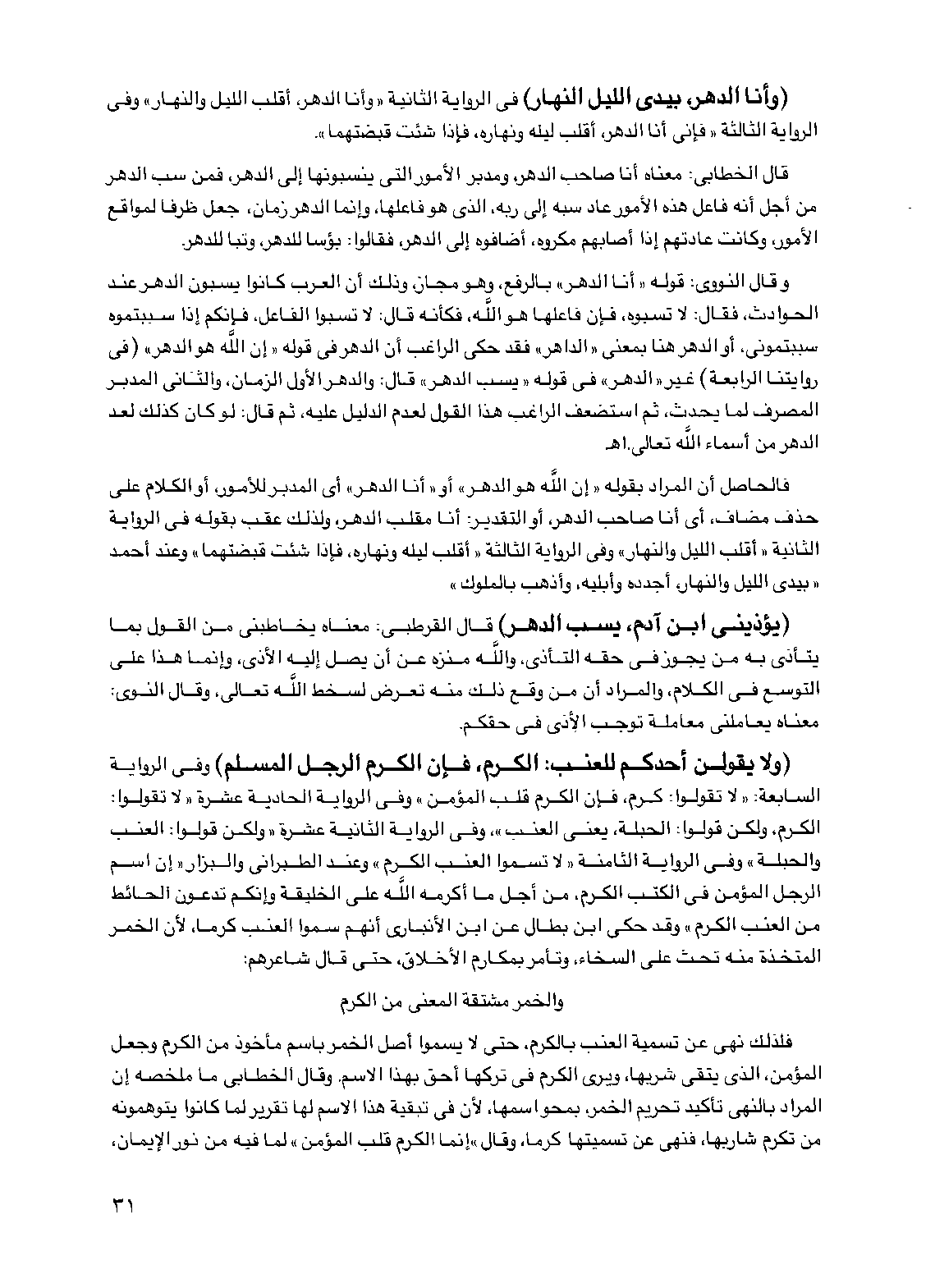 وقال النووي: قوله "أنا الدهر" بالرفع، وهو مجاز، وذلك أن العرب كانوا يسبون الدهر عند الحوادث، فقال: لا تسبوه، فإن فاعلها هو الله، فكأنه قال: لا تسبوا الفاعل فإنكم إذا سببتموه سببتموني، أو الدهر هنا بمعنى "الداهر" فقد حكى الراغب أن الدهر في قوله "إن الله هو الدهر" (في روايتنا الرابعة) غير "الدهر" في قوله "يسب الدهر" قال: والدهر الأول الزمان، والثاني المدبر المصرف لما يحدث، ثم استضعف الراغب هذا القول لعدم الدليل عليه، ثم قال: لو كان كذلك لعد الدهر من أسماء الله تعالى. اهـ.