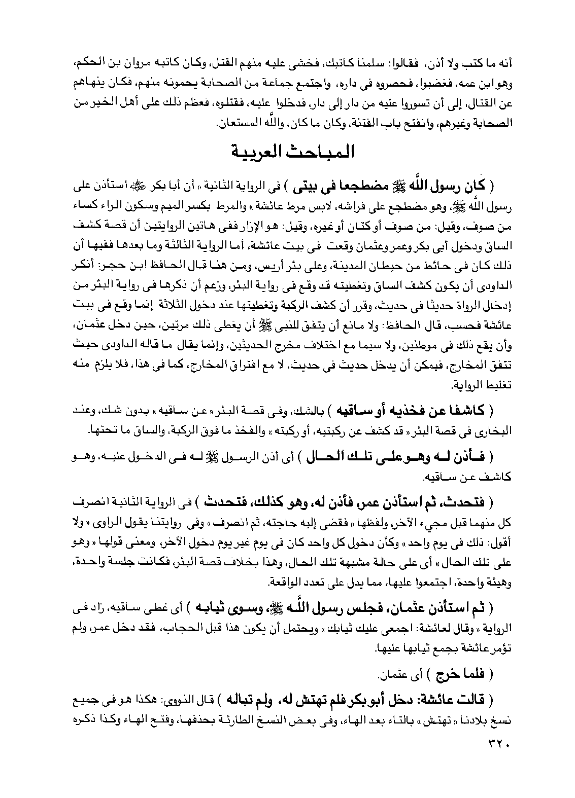 (كان رسول الله صلى الله عليه وسلم مضطجعا في بيتي) في الرواية الثانية "أن أبا بكر رضي الله عنه استأذن على رسول الله صلى الله عليه وسلم وهو مضطجع على فراشه، لابس مرط عائشة" والمرط بكسر الميم وسكون الراء كساء من صوف، وقيل: من صوف أو كتان أو غيره وقيل: هو الإزار ففي هاتين الروايتين أن قصة كشف الساق ودخول أبي بكر وعمر وعثمان وقعت في بيت عائشة، أما الرواية الثالثة وما بعدها ففيها أن ذلك كان في حائط من حيطان المدينة، وعلى بئر أريس، ومن هنا قال الحافظ ابن حجر: أنكر الداودي أن يكون كشف الساق وتغطيته قد وقع في رواية البئر، وزعم أن ذكرها في رواية البئر من إدخال الرواة حديثا في حديث، وقرر أن كشف الركبة وتغطيتها عند دخول الثلاثة إنما وقع في بيت عائشة فحسب قال الحافظ: ولا مانع أن يتفق للنبي صلى الله عليه وسلم أن يغطي ذلك مرتين، حين دخل عثمان وأن يقع ذلك في موطنين ولا سيما مع اختلاف مخرج الحديثين وإنما يقال ما قاله الداودي حيث تتفق المخارج، فيمكن أن يدخل حديث في حديث، لا مع افتراق المخارج كما في هذا فلا يلزم منه تغليط الرواية.