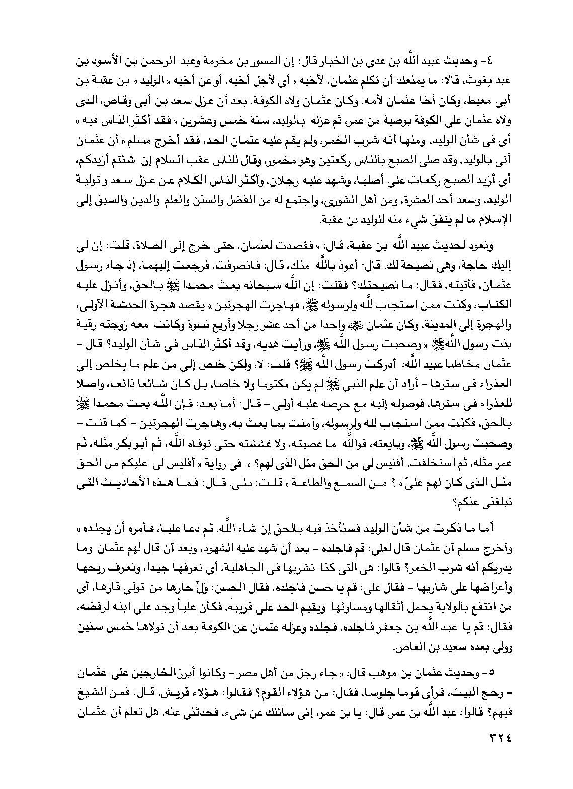 5 - وحديث عثمان بن موهب قال: "جاء رجل من أهل مصر - وكانوا أبرز الخارجين على عثمان - وحج البيت، فرأى قوما جلوسا، فقال: من هؤلاء القوم؟ فقالوا: هؤلاء قريش. قال: فمن الشيخ فيهم؟ قالوا: عبد الله بن عمر. قال: يا بن عمر، إني سائلك عن شيء، فحدثني عنه. هل تعلم أن عثمان