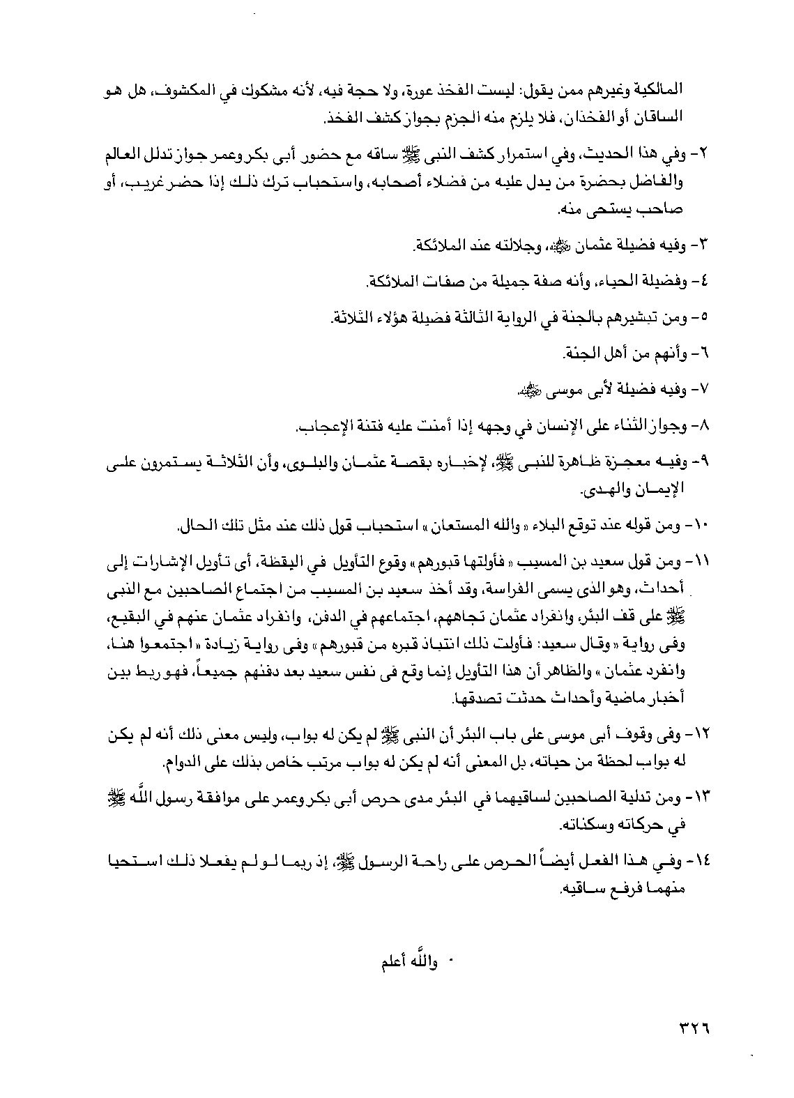 12 - وفي وقوف أبي موسى على باب البئر أن النبي صلى الله عليه وسلم لم يكن له بواب، وليس معنى ذلك أنه لم يكن له بواب لحظة من حياته، بل المعنى أنه لم يكن له بواب مرتب خاص بذلك على الدوام.