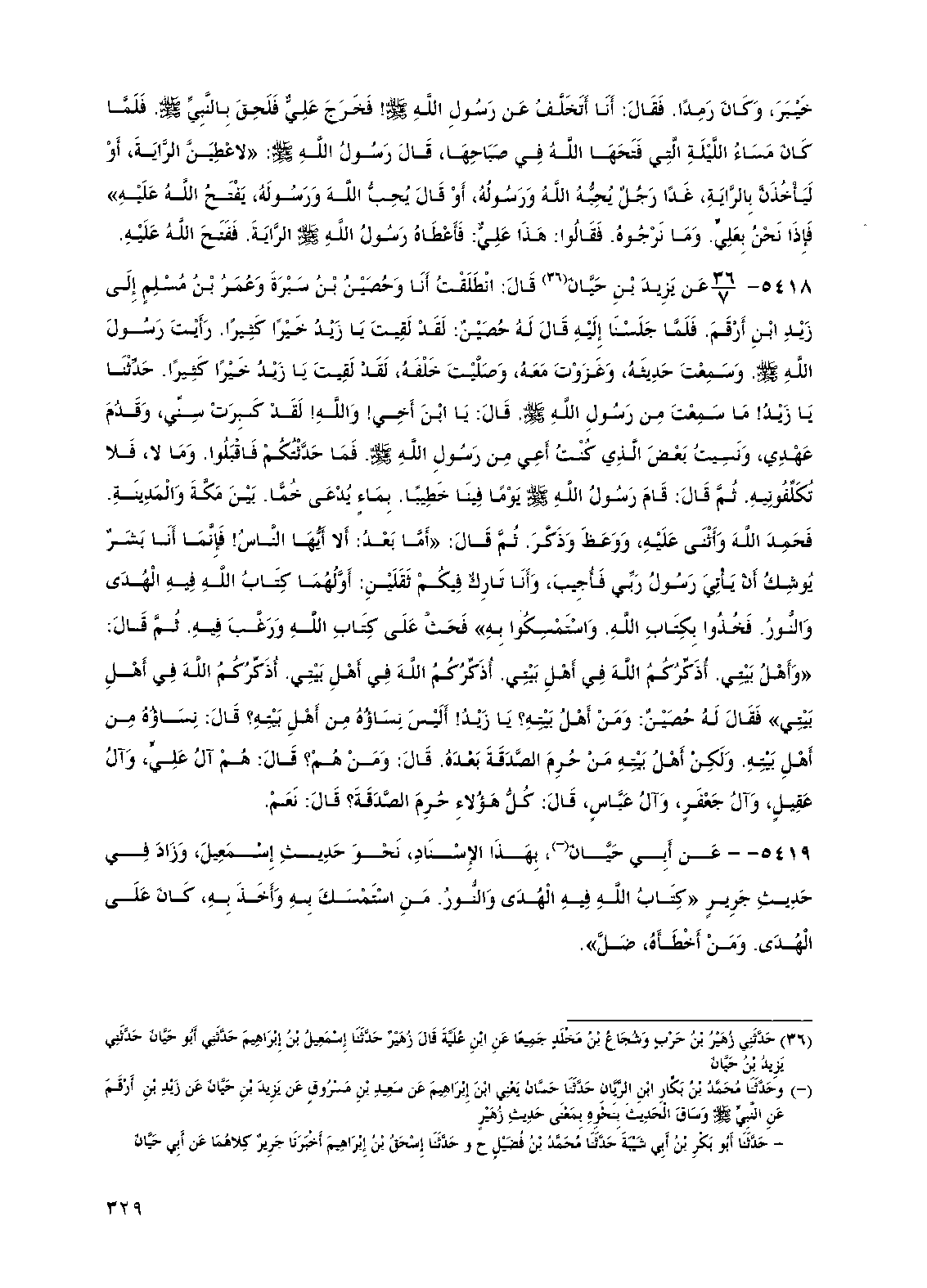 5418 - عن يزيد بن حيان قال: انطلقت أنا وحصين بن سبرة وعمر بن مسلم إلى زيد بن أرقم فلما جلسنا إليه قال له حصين: لقد لقيت يا زيد خيرا كثيرا. رأيت رسول الله صلى الله عليه وسلم وسمعت حديثه وغزوت معه وصليت خلفه، لقد لقيت يا زيد خيرا كثيرا. حدثنا يا زيد! ما سمعت من رسول الله صلى الله عليه وسلم قال: يا ابن أخي! والله! لقد كبرت سني، وقدم عهدي ونسيت بعض الذي كنت أعي من رسول الله صلى الله عليه وسلم. فما حدثتكم فاقبلوا. وما لا، فلا تكلفونيه. ثم قال: قام رسول الله صلى الله عليه وسلم يوما فينا خطيبا. بماء يدعى خما. بين مكة والمدينة. فحمد الله وأثنى عليه، ووعظ وذكر. ثم قال: "أما بعد: ألا أيها الناس! فإنما أنا بشر يوشك أن يأتي رسول ربي فأجيب، وأنا تارك فيكم ثقلين: أولهما كتاب الله فيه الهدى والنور. فخذوا بكتاب الله. واستمسكوا به" فحث على كتاب الله ورغب فيه. ثم قال: "وأهل بيتي. أذكركم الله في أهل بيتي. أذكركم الله في أهل بيتي. أذكركم الله في أهل بيتي" فقال له حصين: ومن أهل بيته؟ يا زيد! أليس نساؤه من أهل بيته؟ قال: نساؤه من أهل بيته. ولكن أهل بيته من حرم الصدقة بعده. قال: ومن هم؟ قال: هم آل علي، وآل عقيل وآل جعفر، وآل عباس، قال: كل هؤلاء حرم الصدقة؟ قال: نعم.