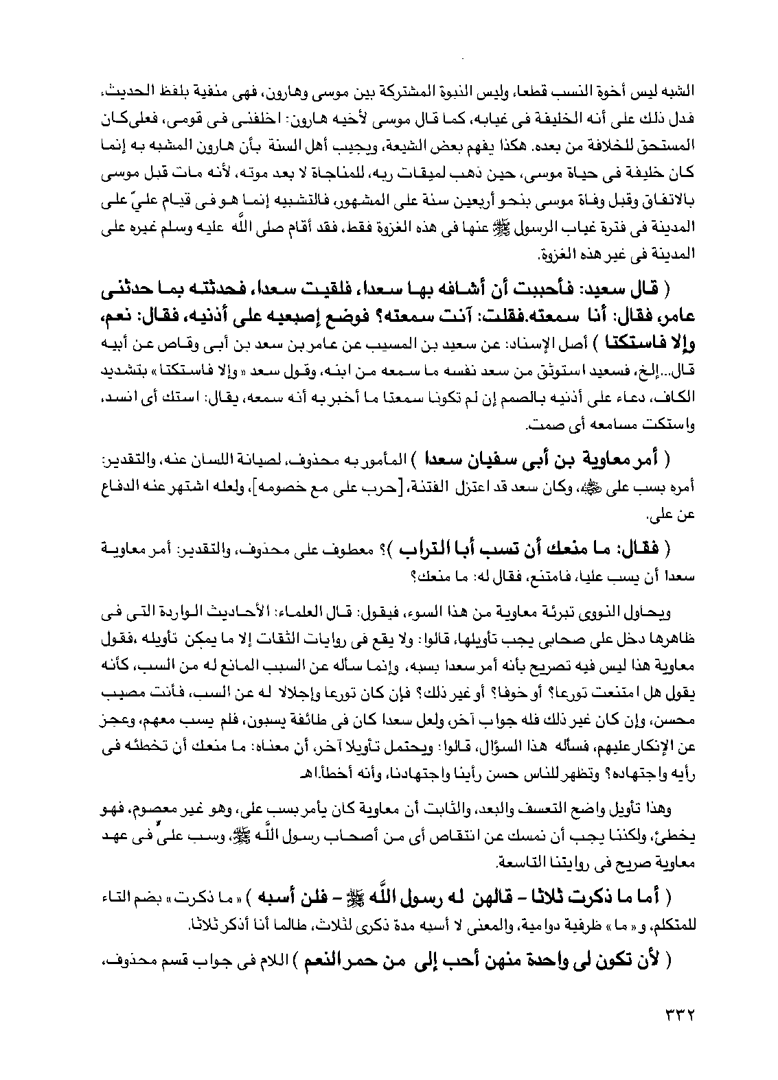 وهذا تأويل واضح التعسف والبعد والثابت أن معاوية كان يأمر بسب علي، وهو غير معصوم، فهو يخطئ، ولكننا يجب أن نمسك عن انتقاص أي من أصحاب رسول الله صلى الله عليه وسلم وسب علي في عهد معاوية صريح في روايتنا التاسعة.