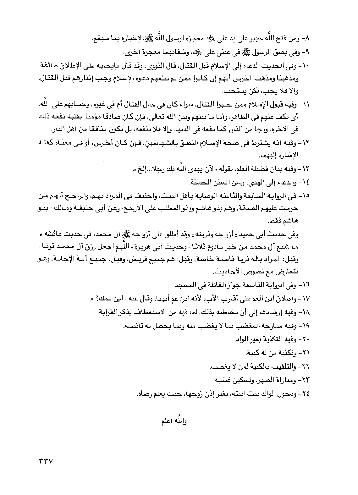 15 - في الرواية السابعة والثامنة الوصاية بأهل البيت، واختلف في المراد بهم، والراجح أنهم من حرمت عليهم الصدقة، وهم بنو هاشم وبنو المطلب على الأرجح، وعن أبي حنيفة ومالك: بنو هاشم فقط.
