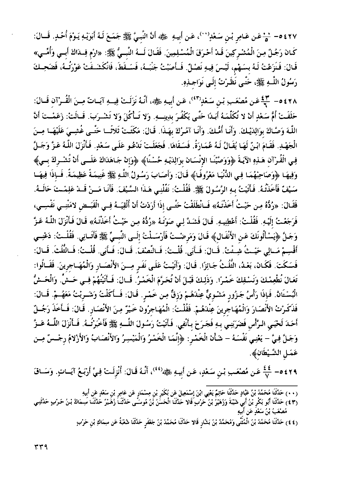 5428 - عن مصعب بن سعد عن أبيه رضي الله عنه أنه نزلت فيه آيات من القرآن قال: حلفت أم سعد أن لا تكلمه أبدا حتى يكفر بدينه. ولا تأكل ولا تشرب. قالت: زعمت أن الله وصاك بوالديك. وأنا أمك. وأنا آمرك بهذا. قال: مكثت ثلاثا حتى غشي عليها من الجهد فقام ابن لها يقال له عمارة فسقاها. فجعلت تدعو على سعد. فأنزل الله عز وجل في القرآن هذه الآية {ووصينا الإنسان بوالديه حسنا} {وإن جاهداك على أن تشرك بي} وفيها {وصاحبهما في الدنيا معروفا} قال: وأصاب رسول الله صلى الله عليه وسلم غنيمة عظيمة. فإذا فيها سيف فأخذته. فأتيت به الرسول صلى الله عليه وسلم. فقلت: نفلني هذا السيف. فأنا من قد علمت حاله. فقال: "رده من حيث أخذته" فانطلقت حتى إذا أردت أن ألقيه في القبض لامتني نفسي، فرجعت إليه. فقلت: أعطنيه. قال فشد لي صوته "رده من حيث أخذته" قال فأنزل الله عز وجل {يسألونك عن الأنفال} قال ومرضت فأرسلت إلى النبي صلى الله عليه وسلم فأتاني. فقلت: دعني أقسم مالي حيث شئت. قال: فأبى قلت: فالنصف قال: فأبى قلت: فالثلث قال: فسكت. فكان بعد الثلث جائزا قال: وأتيت على نفر من الأنصار والمهاجرين فقالوا: تعال نطعمك ونسقك خمرا وذلك قبل أن تحرم الخمر. قال: فأتيتهم في حش والحش البستان فإذا رأس جزور مشوي عندهم وزق من خمر. قال: فأكلت وشربت معهم. قال: فذكرت الأنصار والمهاجرين عندهم. فقلت: المهاجرون خير من الأنصار قال: فأخذ رجل أحد لحيي الرأس فضربني به فجرح بأنفي. فأتيت رسول الله صلى الله عليه وسلم فأخبرته. فأنزل الله عز وجل في - يعني نفسه - شأن الخمر: {إنما الخمر والميسر والأنصاب والأزلام رجس من عمل الشيطان}