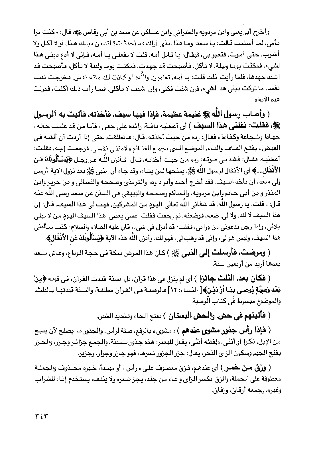 (وأصاب رسول الله صلى الله عليه وسلم غنيمة عظيمة، فإذا فيها سيف فأخذته، فأتيت به الرسول صلى الله عليه وسلم فقلت: نفلني هذا السيف) أي أعطنيه نافلة زائدة على حقي "فأنا من قد علمت حاله" جهادا وشجاعة وكفاءة "فقال: رده من حيث أخذته قال: فانطلقت حتى إذا أردت أن ألقيه في القبض" بفتح القاف والباء الموضع الذي يجمع الغنائم "لامتني نفسي فرجعت إليه فقلت: أعطنيه. فقال: فشد لي صوته: رده من حيث أخذته قال: فأنزل الله عز وجل {يسألونك عن الأنفال} أي الأنفال لرسول الله صلى الله عليه وسلم يمنحها لمن يشاء، وقد جاء أن النبي صلى الله عليه وسلم بعد نزول الآية أرسل إلى سعد أن يأخذ السيف فقد أخرج أحمد وأبو داود والترمذي وصححه والنسائي وابن جرير وابن المنذر وابن أبي حاتم وابن مردويه والحاكم وصححه والبيهقي في السنن عن سعد رضي الله عنه قال: "قلت: يا رسول الله قد شفاني الله تعالى اليوم من المشركين، فهب لي هذا السيف. قال: إن هذا السيف لا لك ولا لي ضعه فوضعته، ثم رجعت فقلت: عسى يعطى هذا السيف اليوم من لا يبلي بلائي، وإذا رجل يدعوني من ورائي، فقلت: قد أنزل في شيء، قال عليه الصلاة والسلام: كنت سألتني هذا السيف، وليس هو لي، وإني قد وهب لي، فهو لك، وأنزل الله هذه الآية {يسألونك عن الأنفال}