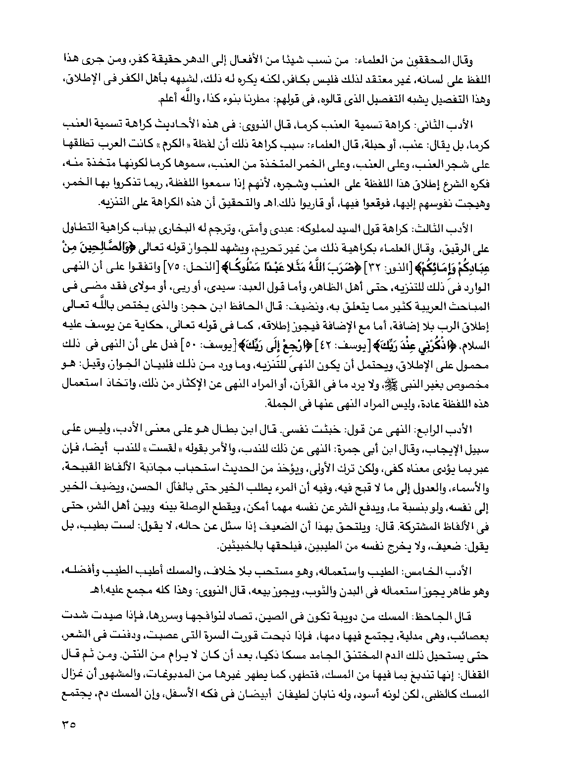 الأدب الثاني: كراهة تسمية العنب كرما، قال النووي: في هذه الأحاديث كراهة تسمية العنب كرما، بل يقال: عنب، أو حبلة، قال العلماء: سبب كراهة ذلك أن لفظة "الكرم" كانت العرب تطلقها على شجر العنب، وعلى العنب، وعلى الخمر المتخذة من العنب، سموها كرما لكونها متخذة منه، فكره الشرع إطلاق هذا اللفظة على العنب وشجره، لأنهم إذا سمعوا اللفظة، ربما تذكروا بها الخمر، وهيجت نفوسهم إليها، فوقعوا فيها، أو قاربوا ذلك. اهـ والتحقيق أن هذه الكراهة على التنزيه.