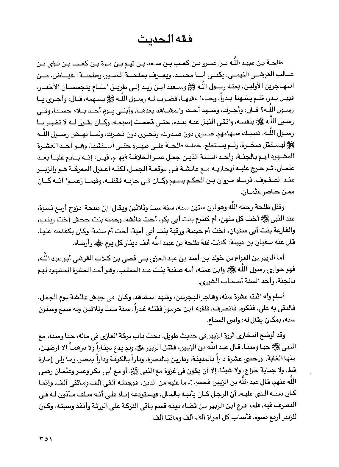 طلحة بن عبيد الله بن عمرو بن كعب بن سعد بن تيم بن مرة بن كعب بن لؤي بن غالب القرشي التيمي، يكنى أبا محمد ويعرف بطلحة الخير، وطلحة الفياض، من المهاجرين الأولين بعثه رسول الله صلى الله عليه وسلم وسعيد بن زيد إلى طريق الشام يتجسسان الأخبار، قبيل بدر، فلم يشهدا بدرا، وجاءا عقبها فضرب له رسول الله صلى الله عليه وسلم بسهمه، قال: وأجري يا رسول الله؟ قال: وأجرك، وشهد أحدا والمشاهد بعدها وأبلى يوم أحد بلاء حسنا، وقى رسول الله صلى الله عليه وسلم بنفسه واتقى النبل عنه بيده حتى قطعت إصبعه، وكان يقول له لا تظهر يا رسول الله، تصبك سهامهم، صدري دون صدرك، ونحري دون نحرك ولما نهض رسول الله صلى الله عليه وسلم ليستقل صخرة ولم يستطع حمله طلحة على ظهره حتى استقلها وهو أحد العشرة المشهود لهم بالجنة وأحد الستة الذين جعل عمر الخلافة فيهم قيل: إنه بايع عليا بعد عثمان، ثم خرج عليه ليحاربه مع عائشة في موقعة الجمل، لكنه اعتزل المعركة هو والزبير عند الصفوف فرماه مروان بن الحكم بسهم وكان في حزبه فقتله وفيما زعموا أنه كان ممن حاصر عثمان.