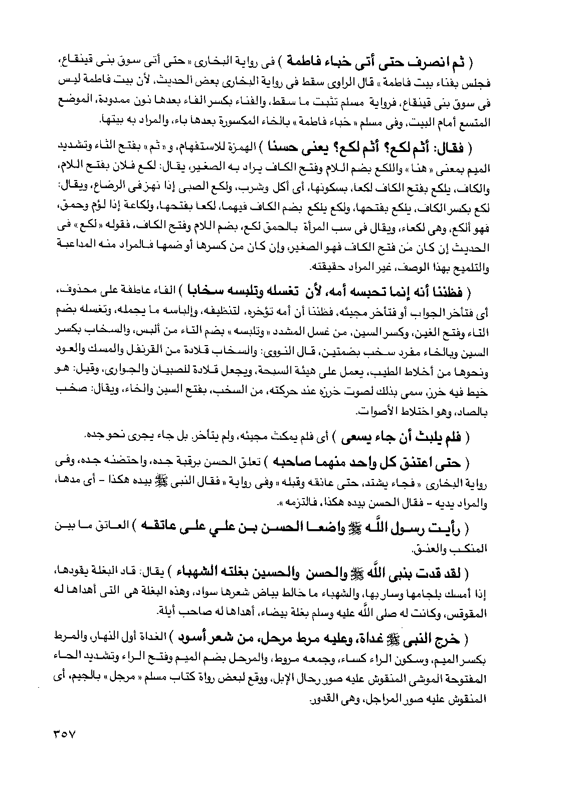 (ثم انصرف حتى أتى خباء فاطمة) في رواية البخاري "حتى أتى سوق بني قينقاع، فجلس بفناء بيت فاطمة" قال الراوي سقط في رواية البخاري بعض الحديث، لأن بيت فاطمة ليس في سوق بني قينقاع، فرواية مسلم تثبت ما سقط والفناء بكسر الفاء بعدها نون ممدودة، الموضع المتسع أمام البيت وفي مسلم "خباء فاطمة" بالخاء المكسورة بعدها باء والمراد به بيتها.