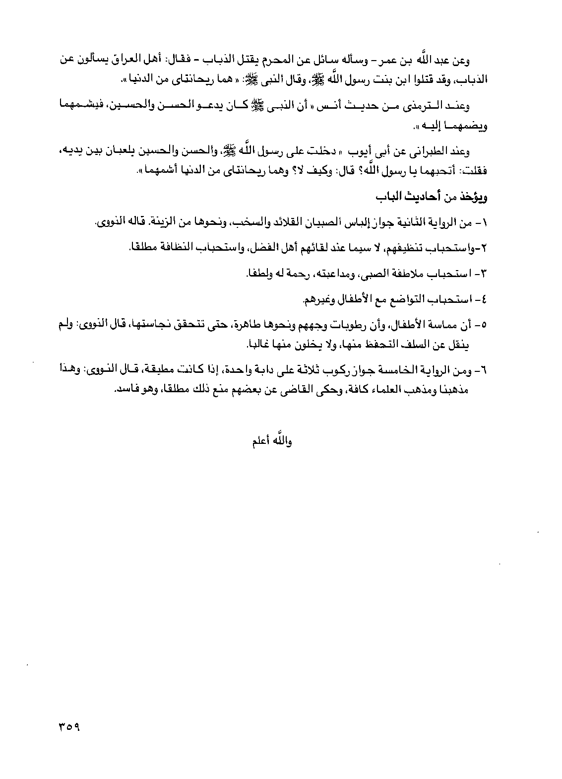 5 - أن مماسة الأطفال وأن رطوبات وجههم ونحوها طاهرة حتى تتحقق نجاستها قال النووي: ولم ينقل عن السلف التحفظ منها، ولا يخلون منها غالبا.