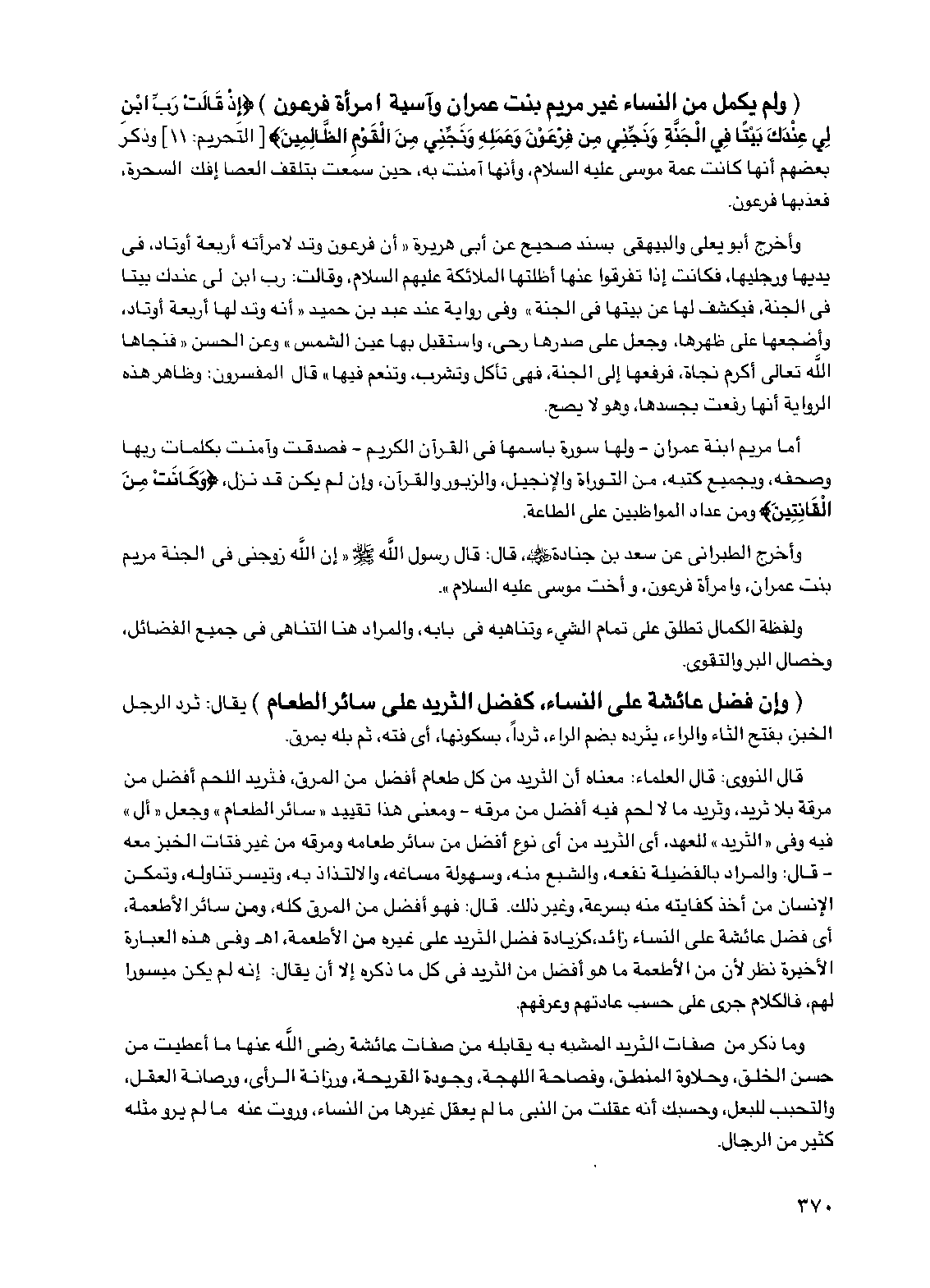 قال النووي: قال العلماء: معناه أن الثريد من كل طعام أفضل من المرق فثريد اللحم أفضل من مرقة بلا ثريد، وثريد ما لا لحم فيه أفضل من مرقه - ومعنى هذا تقييد "سائر الطعام" وجعل "أل" فيه وفي "الثريد" للعهد، أي الثريد من أي نوع أفضل من سائر طعامه ومرقه من غير فتات الخبز معه قال: والمراد بالفضيلة نفعه، والشبع منه، وسهولة مساغه والالتذاذ به وتيسر تناوله وتمكن الإنسان من أخذ كفايته منه بسرعة وغير ذلك. قال: فهو أفضل من المرق كله ومن سائر الأطعمة أي فضل عائشة على النساء زائد كزيادة فضل الثريد على غيره من الأطعمة اهـ وفي هذه العبارة الأخيرة نظر لأن من الأطعمة ما هو أفضل من الثريد في كل ما ذكره إلا أن يقال: إنه لم يكن ميسورا لهم، فالكلام جرى على حسب عادتهم وعرفهم.